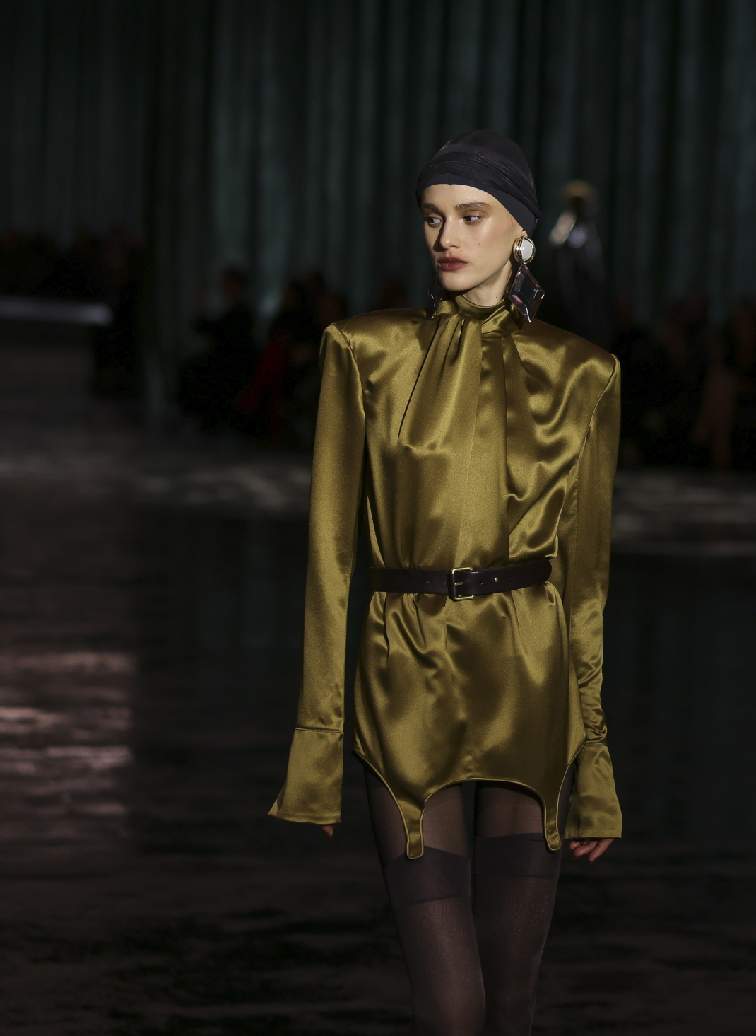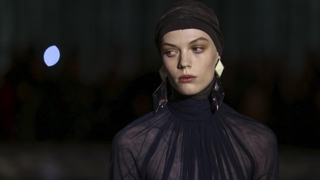 Με μια πασαρέλα που θύμιζε τους δρόμους μετά από βροχή, βαθυπράσινες βελούδινες κουρτίνες που κάλυπταν τους τοίχους και καναπέδες για τους καλεσμένους που παρακολουθούσαν, η επίδειξη θύμιζε μια λαμπερή χειμωνιάτικη βραδιά στο Παρίσι.