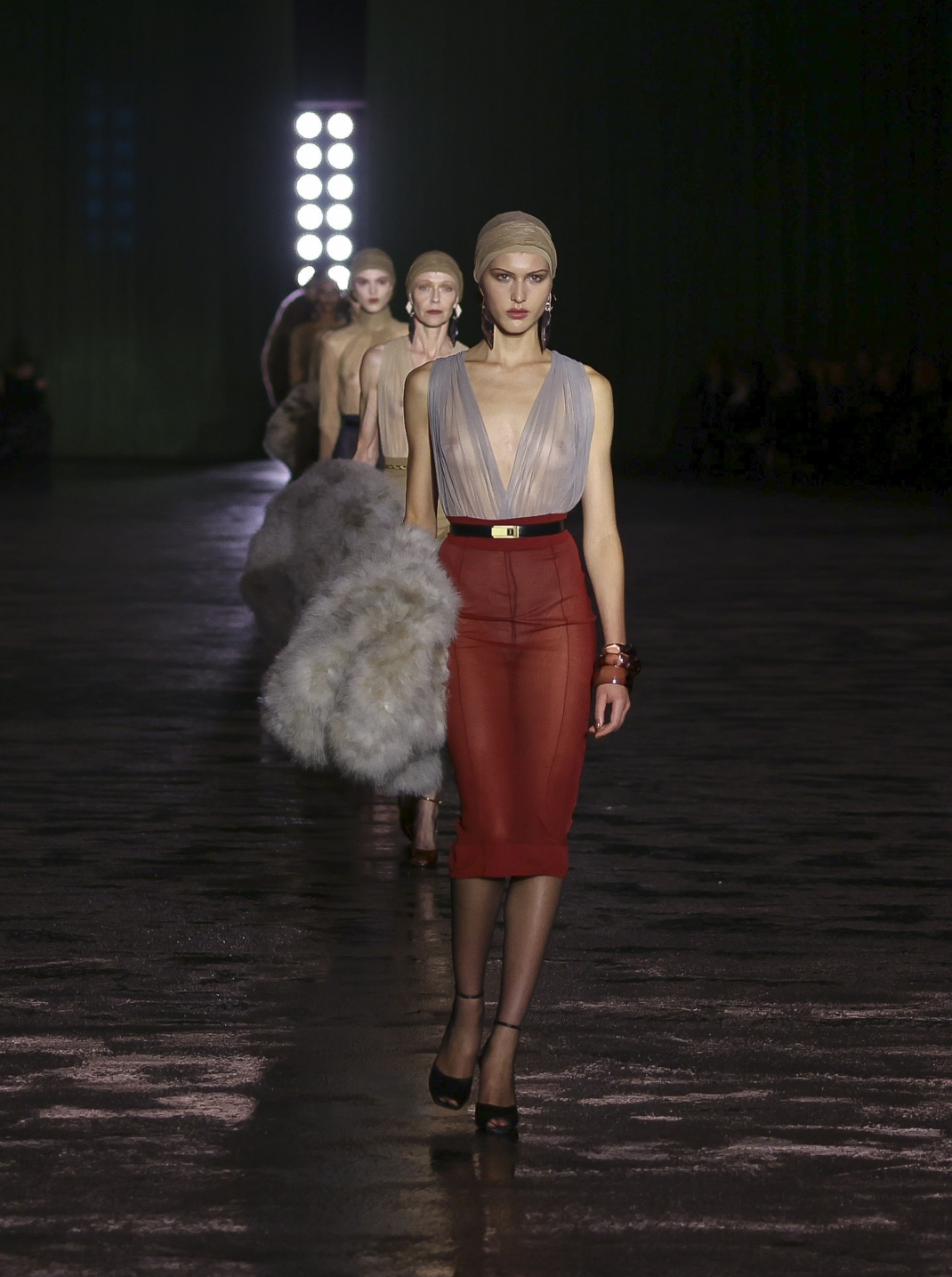 Εστιάζοντας σε ημιδιαφανείς σιλουέτες που αποδίδονται σε άπειρες εκδοχές, ο Vaccarello επένδυσε σε στενά μεταξωτά φορέματα που θύμιζαν νεγκλιζέ αποκάλυπταν και κάλυπταν ταυτόχρονα το σώμα. Τα two pieces και τα διάφανα φορέματα έφταναν σε μήκος κάτω από το γόνατο και επεκτείνονται σε μακριά μανίκια, ντύνοντας θαρρείς το σώμα με μια υφασμάτινη αύρα.