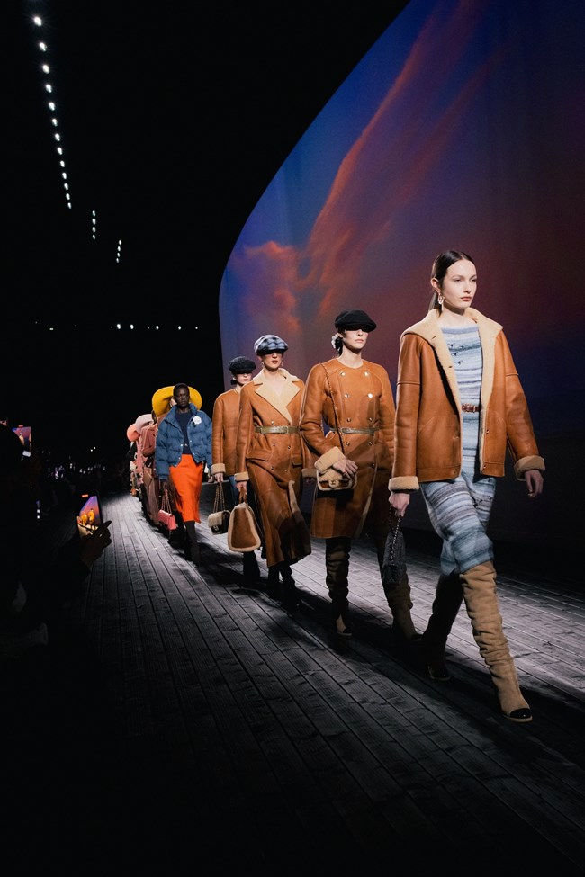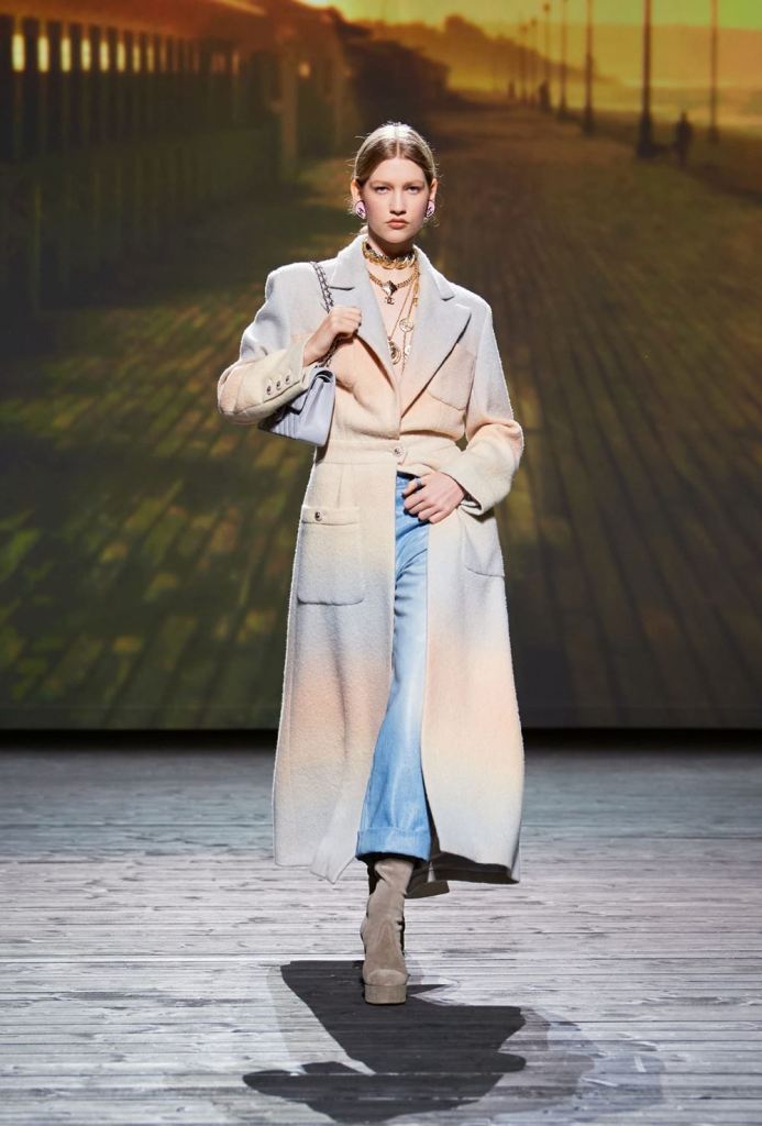 Μακριά παλτό φοριούνται με λεπτή ζώνη στη μέση ή πάνω από tweed κοστούμια – με ζιπ κιλότ, με πλισέ φούστες ή cropped παντελόνια, φαρδιές παντελόνες συνδυάζονται με άνετες ζακέτες σε σετ που ολοκληρώνονται με μια ζώνη στη μέση, σε κάποια περίπτωση με ζώνη που καταλήγει σε φιόγκο, τα πλεκτά της συλλογή είναι πληθωρικά και σε ένα από τα looks το εξαιρετικό styling συνδυάζει μία χοντρή πλεκτή φούστα με χρυσό ζακάρ σακάκι, ενώ σε κάποια πουλόβερ απεικονίζεται η φύση της Deauville. Οι ζακέτες επιστρέφουν διαρκώς στα looks και τις βλέπουμε να φοριούνται μέσα από κοστούμια, σε three – piece πλεκτά σύνολα, με πλεκτά φορέματα και σε μία περίπτωση με τζιν. Τα denim έχουν αποκτήσει μία ελαφριά γυαλάδα, και εντυπωσιάζουν με τα combos που προτείνονται: μ’ ένα μακρύ ντεγκραντέ παλτό, με shearling τζάκετ και σε denim on denim.
