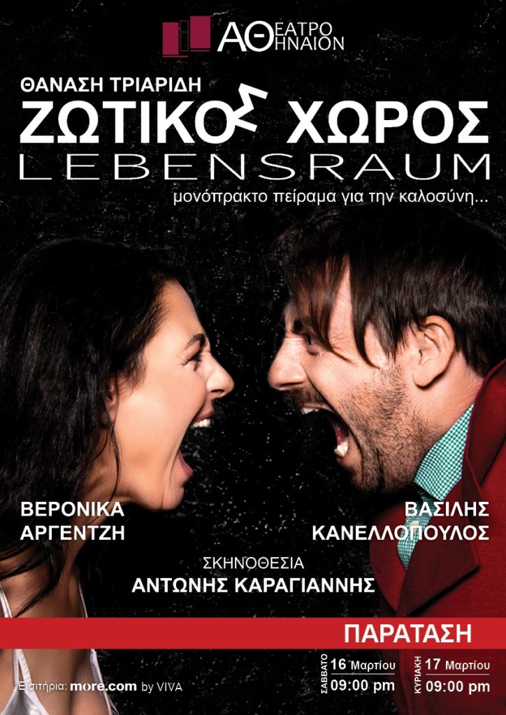 LEBENSRAUM ή αλλιώς Ζωτικός χώρος. Το έργο του Θανάση Τριαρίδη σε σκηνοθεσία Αντώνη Καραγιάννη, με τη Βερόνικα Αργέντζη και τον Βασίλη Κανελλόπουλο, ξεκινάει το ταξίδι του από τη Θεσσαλονίκη, γενέτειρα όλων των συντελεστών. Η πρεμιέρα του έργου θα πραγματοποιηθεί στο Θέατρο ΑΘΗΝΑΙΟΝ την Παρασκευή, 1 Μαρτίου 2024 και ώρα 21:00. Το έργο θα παιχτεί για έξι μόνο παραστάσεις στη Θεσσαλονίκη, προτού συστηθεί στο θεατρικό κοινό της Αθήνας καθώς και σε διάφορες πόλεις της Ελλάδας.