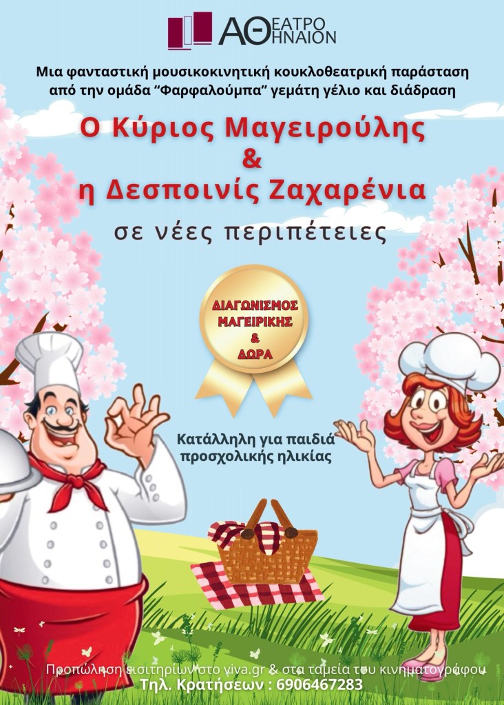 Ελάτε μαζί μας να διασκεδάσουμε, να χορέψουμε, να κάνουμε διαγωνισμό μαγειρικής, να κερδίσουμε δωράκια και να γίνουμε μια όμορφη παρέα με τον κύριο Μαγειρούλη και τη Δεσποινίδα Ζαχαρένια !