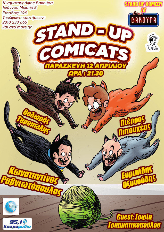 Στον πάντα φιλόξενο χώρο του Cine Βακούρα, οι ταλαντούχοι κωμικοί θα παρουσιάσουν τα καλύτερα αστεία τους, με δόσεις αυτοσαρκασμού και κοινωνικού σχολιασμού και υπόσχονται να μας κάνουν να γουργουρίσουμε από το γέλιο. Τέσσερις αριστόγατοι (όχι της Disney αλλά του stand-up) με τέσσερις διαφορετικές κωμικές προσεγγίσεις έρχονται στο πιο ιστορικό σινεμά της πόλης, για μία παράσταση που αναμένεται να είναι γαταπληκτική!