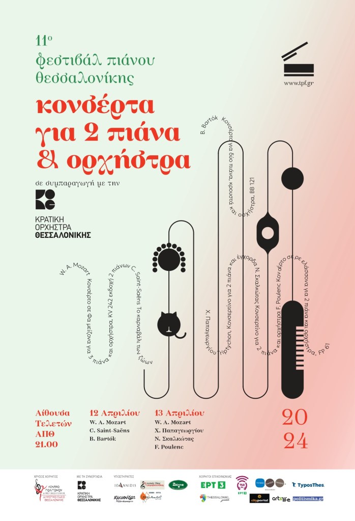 Η Κρατική Ορχήστρα Θεσσαλονίκης συμμετέχει στο Φεστιβάλ Πιάνου Θεσσαλονίκης με δύο μεγάλες συναυλίες, που συνθέτουν ένα μοναδικό κολάζ κάποιων εκ των σημαντικότερων έργων που είναι γραμμένα για δύο πιάνα και ορχήστρα. Ανάμεσα τους τα νεανικά, γεμάτα ζωντάνια, κονσέρτα του Mozart, το λαμπερό κονσέρτο του Poulenc, το εξαιρετικά προκλητικό κονσέρτο για δύο πιάνα και κρουστά του Bartók και φυσικά το περίφημο ‘Καρναβάλι των ζώων’ του Saint-Saëns. Πλάι σε αυτά, δύο πανέμορφα κονσερτίνο – αντιπροσωπευτικά της συνθετικής γραφής – των Σκαλκώτα και Παπαγεωργίου.