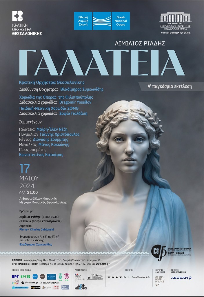 Η Κρατική Ορχήστρα Θεσσαλονίκης, η Εθνική Λυρική Σκηνή και το Μέγαρο Μουσικής Θεσσαλονίκης παρουσιάζουν την παγκόσμια πρεμιέρα της τρίπρακτης όπερας «Γαλάτεια» του Θεσσαλονικιού συνθέτη Αιμίλιου Ριάδη, σε μία εντυπωσιακή σύμπραξη των τριών κορυφαίων πολιτιστικών οργανισμών, με αφορμή αυτή την ιστορική στιγμή στα μουσικά πράγματα της χώρας.