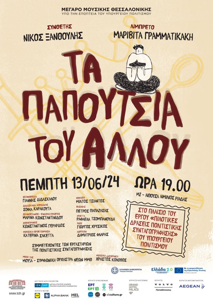 Το Μέγαρο Μουσικής Θεσσαλονίκης παρουσιάζει την Πέμπτη 13 Ιουνίου στις 19:00 στην αίθουσα Αιμίλιος Ριάδης το αλληγορικό μουσικό παραμύθι «Τα Παπούτσια του Άλλου» στο πλαίσιο του ενταγμένου στο Εθνικό Σχέδιο Ανάκαμψης και Ανθεκτικότητας «ΕΛΛΑΔΑ 2.0» έργου «Πιλοτικές Δράσεις Πολιτιστικής Συνταγογράφησης» του Υπουργείου Πολιτισμού.