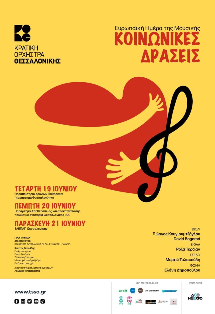 Η Κρατική Ορχήστρα Θεσσαλονίκης τιμά και φέτος την Ευρωπαϊκή Ημέρα Μουσικής με ένα τριήμερο συναυλιών για ανθρώπους που χρειάζονται περισσότερο από όλους την ευεργετική επίδραση της μουσικής, στο πλαίσιο του κοινωνικού της ρόλου ως ένας δημόσιος φορέας πολιτισμού. Έτσι, η Κ.Ο.Θ. θα βρεθεί σε δύο από τα παραρτήματα του Κέντρου Κοινωνικής Πρόνοιας Περιφέρειας Κεντρικής Μακεδονίας, το Θεραπευτήριο Χρόνιων Παθήσεων «Ο Άγιος Παντελεήμονας» και το Παράρτημα Αποθεραπείας και Αποκατάστασης Παιδιών με Αναπηρία Θεσσαλονίκης – ΙΑΑ, καθώς και στην ΕΛΕΠΑΠ Θεσσαλονίκης, προσφέροντας ένα όμορφο πρόγραμμα με το κουαρτέτο εγχόρδων ‘Αυγή’ του Χάυντν και γνωστά τραγούδια του Κώστα Γιαννίδη, σε διασκευή για κουαρτέτο εγχόρδων του Λάζαρου Τσαβδαρίδη.