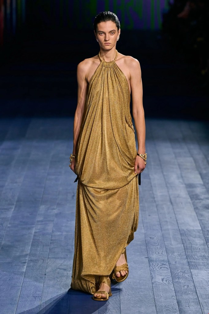 Μεταξύ άλλων, χρησιμοποίησε επίσης τις πιέτες, οι οποίες δημιουργούν ένα πολύ κομψό εφέ όσο κινείται το σώμα, ενώ μεγάλος πρωταγωνιστής της συλλογής ήταν και το drapé, η τεχνική που μας φέρνει στο μυαλό την κλασική τέχνη της γλυπτικής. Το είδαμε σε φορέματα από μετάξι και πανέμορφα κεντήματα, σε φούστες jacquard με εφέ μουαρέ, σε σύνολα όπου όσο το μοντέλο κινείται η drapé φούστα αποκαλύπτει σε κάθε βήμα πως από μέσα υπάρχει παντελόνι, σε φορέματα με έναν ώμο που θυμίζουν αρχαίες Ελληνίδες θεές, αλλά και σε διάφανα tank top με σατέν φινίρισμα. Μία ακόμα απόδειξη πως η μόδα και ο αθλητισμός μπορούν να συναντηθούν είναι η μπλούζα με athleisure αισθητική που κοσμείται με χρυσά φύλλα και μικροσκοπικές παγιέτες.