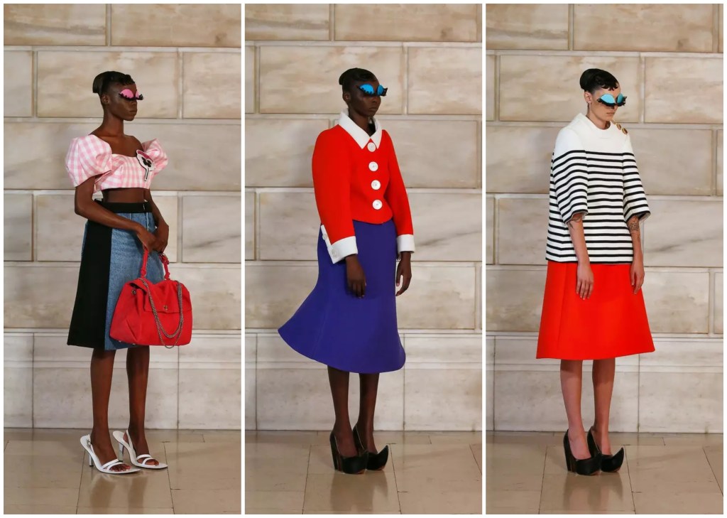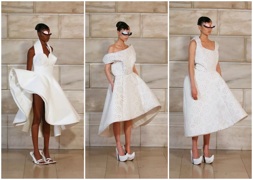 Ακόμα και οι γραμμές των ρούχων δεν ήταν αυτό που κάποιος θα χαρακτήριζε κλασικές και κολακευτικές για τη σιλουέτα, αλλά επέλεξε σχέδια που έδιναν μια bold πινελιά. Εμπνευσμένος από τη ρετρό αισθητική των ‘60s έδωσε στα ρούχα μια μια σχεδόν καρτουνίστικη, αλλά παράλληλα σικ αισθητική, κάτι στο οποίο συνέβαλαν και τα εκκεντρικά παπούτσια με τη μύτη που κοιτούσε προς τα πάνω. Το μπούστο σε κάποια από τα κομμάτια θύμιζε ιδιαίτερα την εποχή των ‘50s, ενώ είδαμε κι ένα στιλάτο φόρεμα εμπνευσμένο από τη Μέριλιν Μονρόε στο «Seven Year Itch». Επιπλέον, δεν έλειπαν και τα εμπνευσμένα από τον 19ο αιώνα κρινολίνα κάτω από τα διάφανα φορέματα από παγιέτα, αλλά και τις μίνι φούστες.