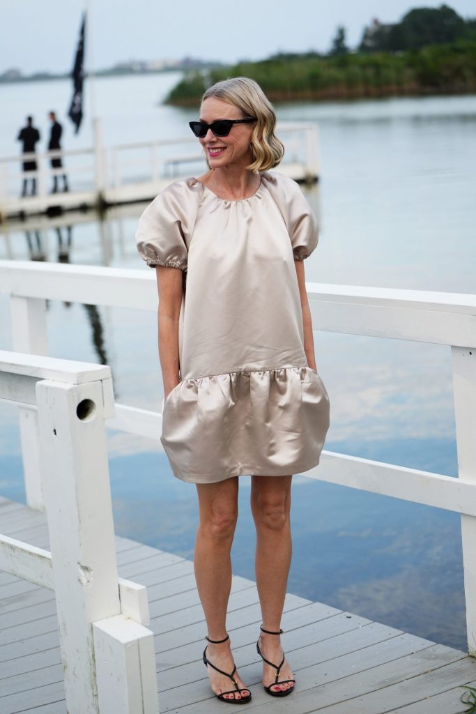 Με ένα σατινέ φόρεμα στο χρώμα της σαμπάνιας από τη Cynthia Rowley εμφανίστηκε στην εκδήλωση The Exploration of Tactility στο Water Mill, στη Νέα Υόρκη, η Νάομι Γουάτς.