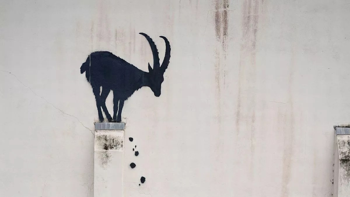 O Banksy επιβεβαίωσε ότι νέα τοιχογραφία με μια ορεινή κατσίκα σκαρφαλωμένη σε ένα ψηλό σημείο είναι το πιο πρόσφατο έργο του. Η σιλουέτα της κατσίκας, με τις πέτρες να πέφτουν από κάτω της και μια κάμερα CCTV να την παρακολουθεί, είναι στο χαρακτηριστικό του στυλ με στένσιλ και έχει εμφανιστεί σε έναν τοίχο κοντά στη γέφυρα Kew στο Richmond, στο νοτιοδυτικό Λονδίνο.