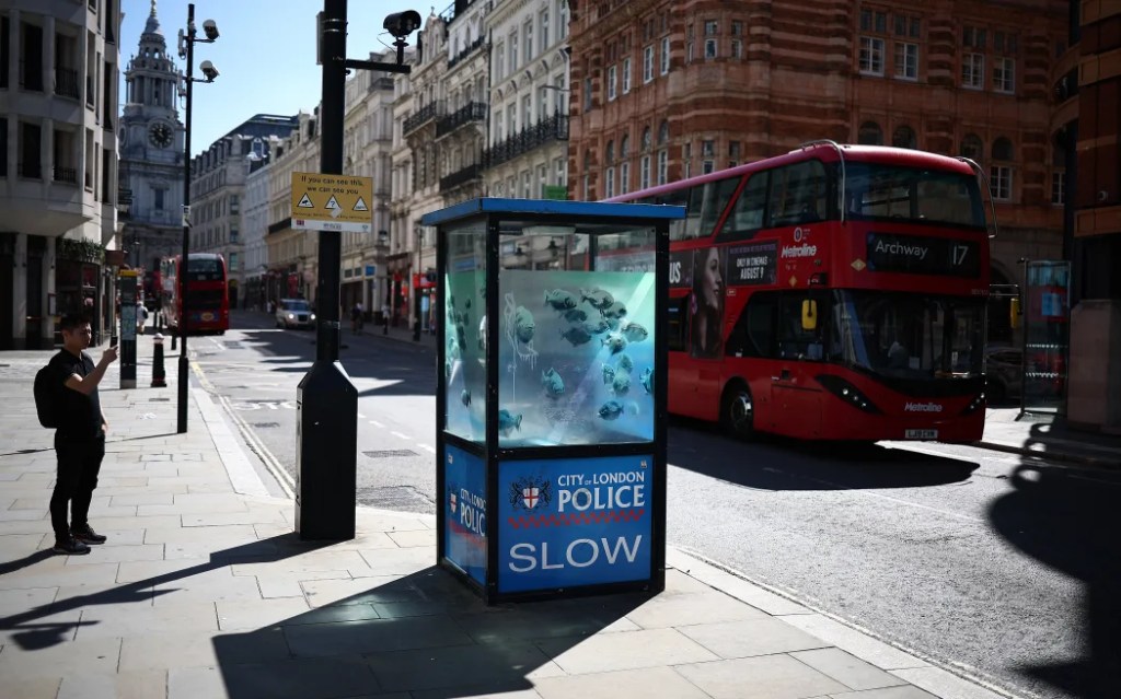 Τα ψάρια που απεικονίζονται στο αστυνομικό κουτί διαφέρουν σε στυλ από τα προηγούμενα έξι έργα σιλουέτας που ο Banksy έχει δηλώσει ως δικά του τις τελευταίες ημέρες. Δύο αστυνομικοί του City of London είδαν αρχικά το νέο έργο του Banksy πριν τραβήξουν φωτογραφίες. Ένας αστυνομικός δήλωσε στο πρακτορείο ειδήσεων PA ότι τους ζητήθηκε να επιθεωρήσουν το έργο τέχνης αφού εντοπίστηκε στις κάμερες CCTV και ότι περίμεναν να ακούσουν τι θα γίνει με αυτό. Η διοικητική αρχή του City of London δήλωσε αργότερα ότι εργάζεται για να «διατηρήσει» το νέο έργο τέχνης του Banksy που εμφανίστηκε την Κυριακή.