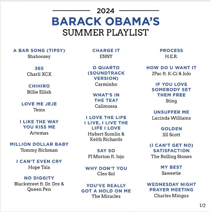 Ο 44ος Αμερικανός Πρόεδρος απολαμβάνει επίσης να ακούει το τραγούδι της Billie Eilish «Chihiro» από το άλμπουμ «Hit Me Hard and Soft», το «Texas Hold ‘Em» της Beyoncé από το «Cowboy Carter», το «Perro Negro» του Bad Bunny, το «A Bar Song (Tipsy)» του Shaboozey, ανάμεσα στους Tems, Bonny Light Horseman, Pharoah Sanders, Samara Joy και Charles Mingus.