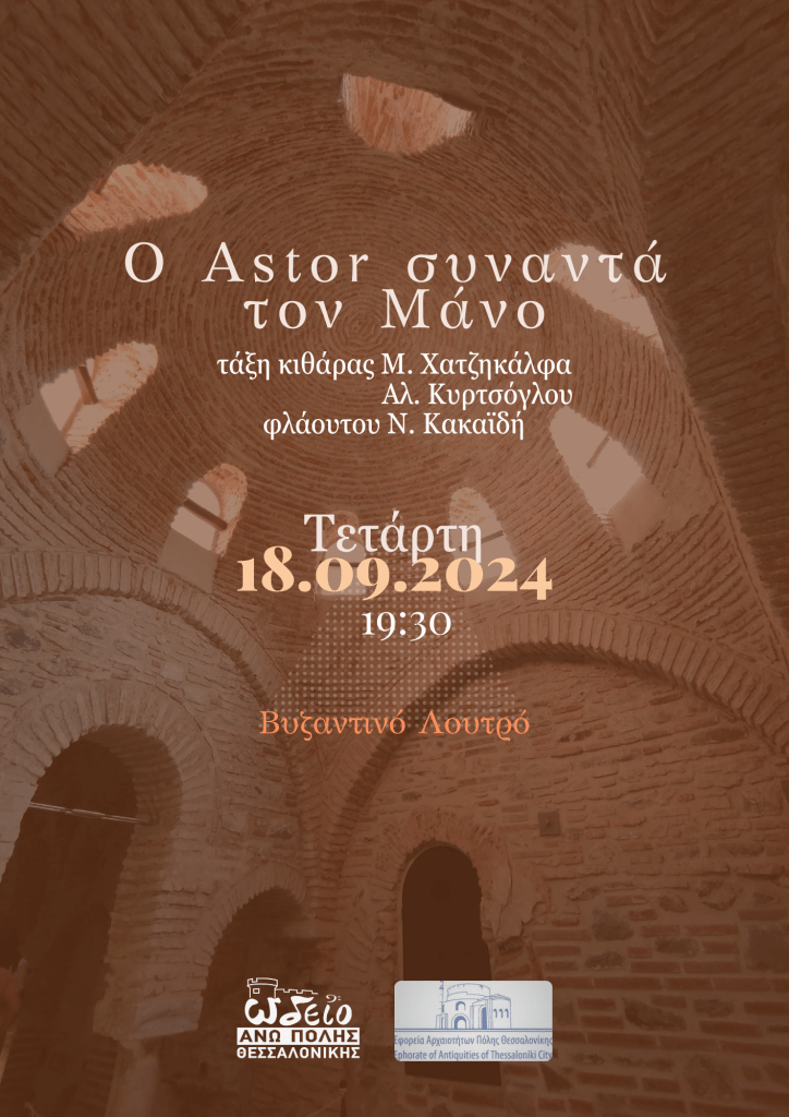 Η Εφορεία Αρχαιοτήτων Πόλης Θεσσαλονίκης φιλοξενεί στο μοναδικό Βυζαντινό Λουτρό της οδού Θεοτοκοπούλου τρεις ξεχωριστές συναυλίες του Ωδείου Άνω Πόλης με ελεύθερη είσοδο για περιορισμένο αριθμό θεατών. Για κράτηση θέσης καλείτε από Δευτέρα 16 Σεπτεμβρίου και ώρες 11.00 έως 13.00 στο τηλέφωνο 2310.263703.