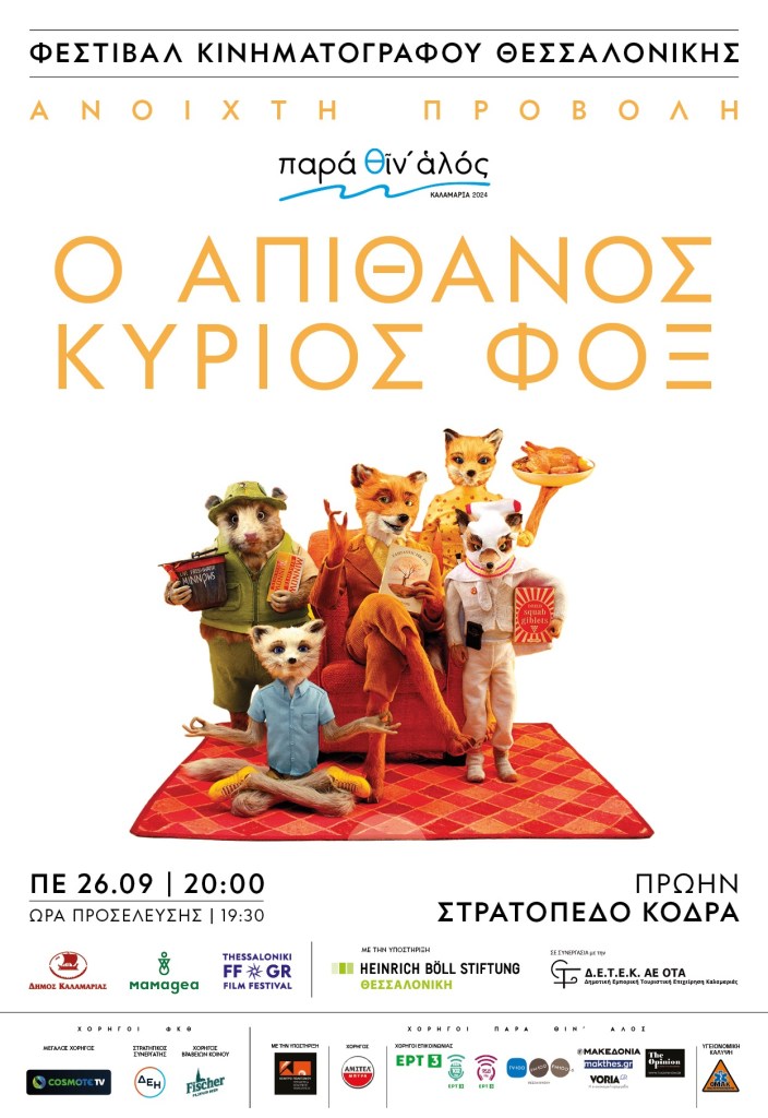 Το Φεστιβάλ Κινηματογράφου Θεσσαλονίκης με χαρά συμμετέχει στο φεστιβάλ Παρά θιν’ αλός του Δήμου Καλαμαριάς παρουσιάζοντας σε μια ανοιχτή προβολή για μικρούς και μεγάλους την ταινία κινουμένων σχεδίων Ο απίθανος κύριος Φοξ (Fantastic Mr. Fox) του Γουές Άντερσον, την Πέμπτη 26 Σεπτεμβρίου, στο πρώην Στρατόπεδο Μακεδονομάχου Κόδρα.