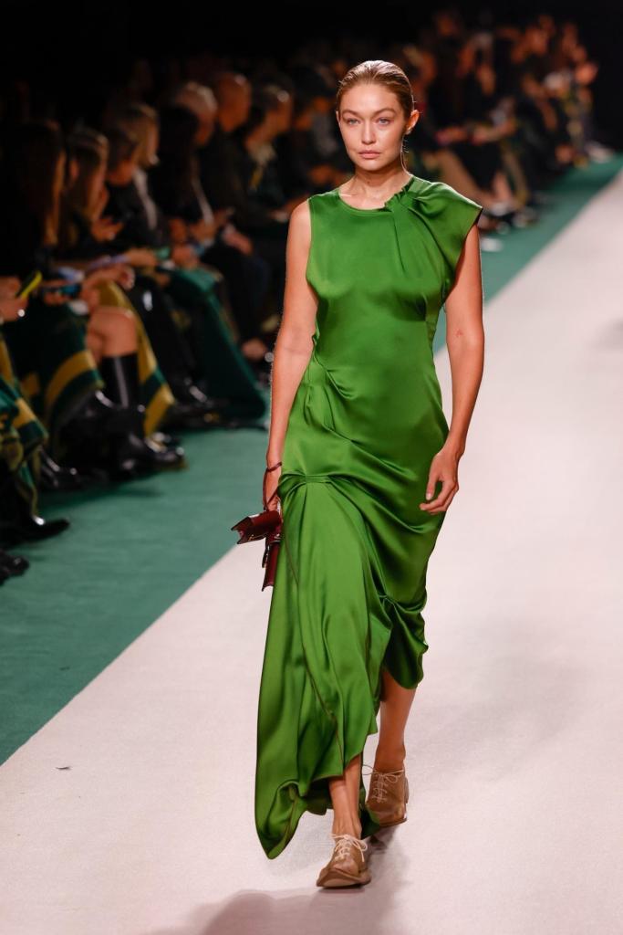 Η Βικτόρια Μπέκαμ παρουσίασε επιπλέον μια νέα εκδοχή του φορέματος «Bella», το οποίο είναι υπεύθυνο για την άνοδο στις πωλήσεις του brand, και το είδαμε φορεμένο από την Τζίτζι Χαντίντ, σε μια απόχρωση που στα διεθνή μέσα χαρακτηρίστηκε ως «πράσινο των φυκιών», και είναι ήδη διαθέσιμο online και κοστίζει 1150 ευρώ. Το φόρεμα θύμισε το iconic πράσινο φόρεμα της Κίρα Νάιτλι στο φιλμ Atonement (2007).