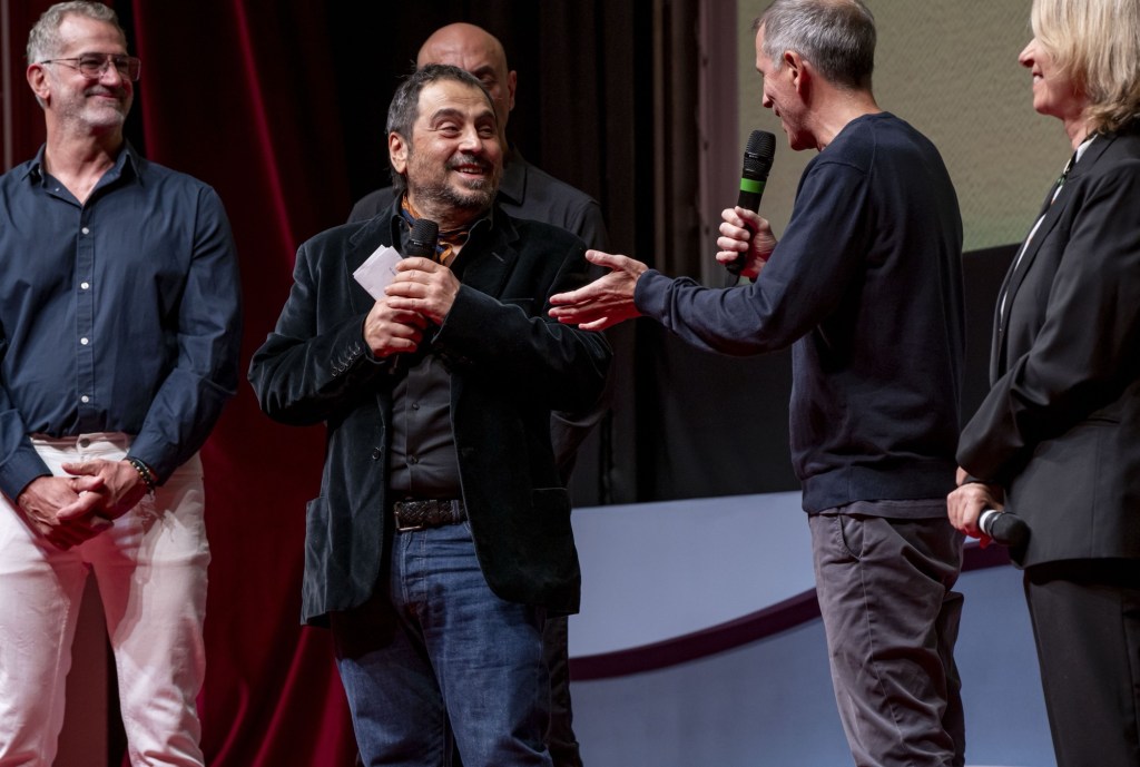 Παίρνοντας τον λόγο, ο Πάνος Χ. Κούτρας ευχαρίστησε το Φεστιβάλ, τη γενική διευθύντρια Ελίζ Ζαλαντό, τον Ορέστη Ανδρεαδάκη και την επικεφαλής του Ελληνικού Προγράμματος, Ελένη Ανδρουτσοπούλου. «Το 1999 ήρθαμε με όλη την ομάδα για να δείξουμε την Επίθεση του γιγαντιαίου μουσακά με την ορμή, το κέφι και το θράσος που την είχαμε φτιάξει. Όλοι πιστεύαμε πως είχαμε κάνει κάτι σημαντικό, χωρίς να ξέρουμε τι μας περιμένει. Διότι τόσο πριν όσο και μετά την προβολή ακούσαμε πολλά. Ότι ήρθαν τα “σκουπίδια”, ότι “δεν σεβόμαστε το Φεστιβάλ”, ότι “βεβηλώσαμε έναν ιερό τόπο” και πολλά ακόμα», θυμήθηκε ο σκηνοθέτης.
