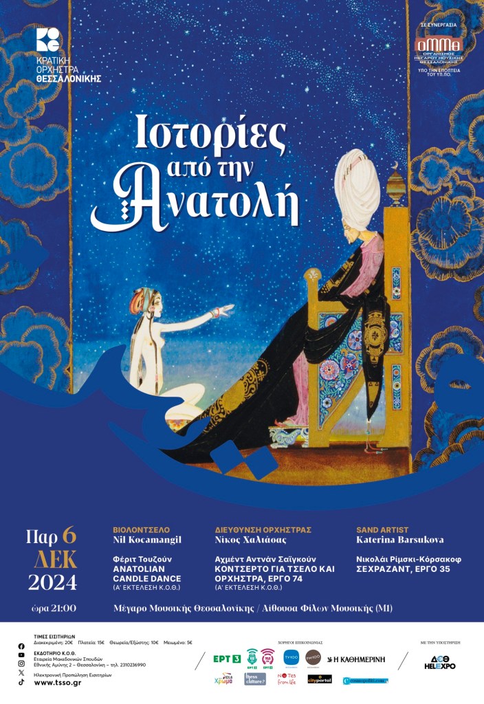Η Κρατική Ορχήστρα Θεσσαλονίκης διηγείται υπέροχες ιστορίες από την Ανατολή, μέσα από έργα Τούρκων συνθετών του περασμένου αιώνα, όπως οι Φέριτ Τουζούν και Αχμέντ Αντνάν Σαϊγκούν, αλλά και την παραμυθένια ‘Σεχραζάτ’ του Ρίμσκι-Κόρσακοφ. Συμπράττει η κορυφαία Τουρκάλα τσελίστρια Nil Kocamangil, που έχει ιδρύσει και διευθύνει μεταξύ άλλων την Διεθνή Μουσική Ακαδημία της Κωνσταντινούπολης και το Διεθνές Φεστιβάλ Μουσικής Δωματίου της Κωνσταντινούπολης, ενώ την Κ.Ο.Θ. διευθύνει ο Νίκος Χαλιάσας.