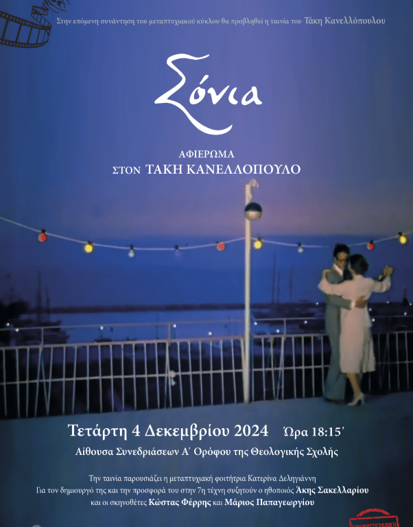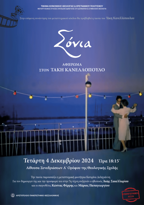 Η Κινηματογραφική Λέσχη του Τμήματος Κοινωνικής Θεολογίας και Χριστιανικού Πολιτισμού του ΑΠΘ διοργανώνει, την Τετάρτη 4 Δεκεμβρίου 2024 και ώρα 18.15, στην Αίθουσα Συνεδριάσεων του Α΄ ορόφου της Θεολογικής Σχολής του ΑΠΘ, ένα αφιέρωμα στον σκηνοθέτη Τάκη Κανελλόπουλο, με την προβολή της ταινίας «Σόνια».