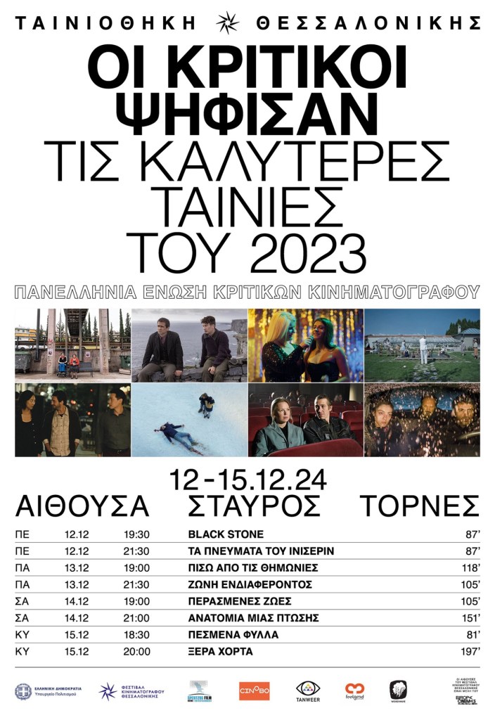 Μια επιλογή από τη λίστα με τις κορυφαίες εγχώριες και ξένες ταινίες που κυκλοφόρησαν στις ελληνικές αίθουσες το 2023, όπως προέκυψε από την ψηφοφορία των μελών της Πανελλήνιας Ένωσης Κριτικών Κινηματογράφου (ΠΕΚΚ), θα προβληθούν στο πλαίσιο της Ταινιοθήκης Θεσσαλονίκης, στην αίθουσα Σταύρος Τορνές (12-15 Δεκεμβρίου 2024).