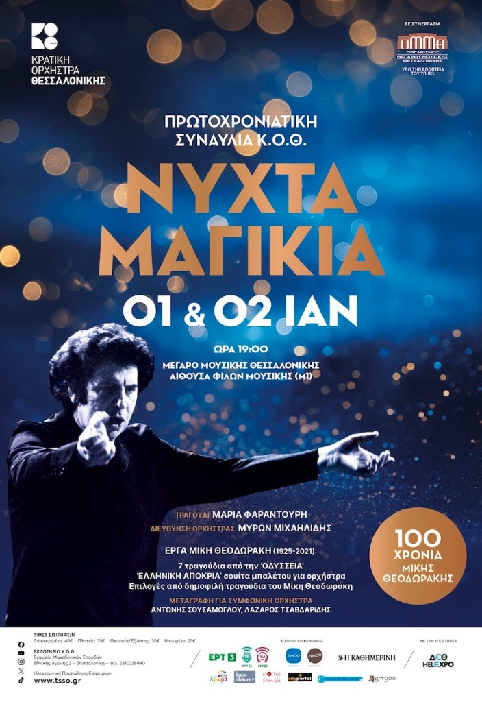 Το 2025 συμπληρώνονται 100 χρόνια από τη γέννηση του κορυφαίου Έλληνα συνθέτη Μίκη Θεοδωράκη και η Κρατική Ορχήστρα Θεσσαλονίκης υποδέχεται το νέο χρόνο, σε συνεργασία με τον Ο.Μ.Μ.Θ., με υπέροχα έργα αυτού του κολοσσού της ελληνικής μουσικής. Μαζί με την ορχήστρα η κατ’ εξοχήν ερμηνεύτρια των έργων του Μαρία Φαραντούρη και ο μαέστρος Μύρων Μιχαηλίδης, που διετέλεσε επί σειρά ετών Διευθυντής της Κ.Ο.Θ..