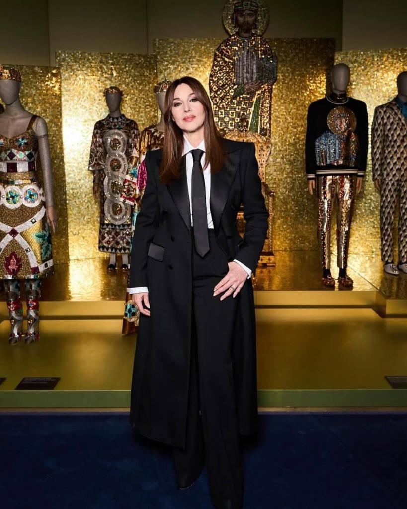 Η Μόνικα Μπελούτσι φορώντας ένα tuxedo παρευρέθηκε στην έκθεση «Du Cœur À La Main» του οίκου μόδας Dolce & Gabbana στο Grand Palais στο Παρίσι. Το μαύρο κοστούμι Dolce & Gabbana, που αποτελούνταν απ΄πο ένα μακρύ σακάκι και wide-leg παντελόνι, κράτησε τις ισσοροπίες ανάμεσα στο κλασικό και το μοντέρνο. Το μακιγιάζ και το sleek, ίσιο χτένισμα της Μπελούτσι άφησαν την εμφάνιση καθαρή και μίνιμαλ.