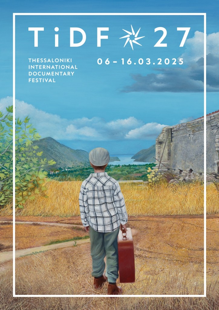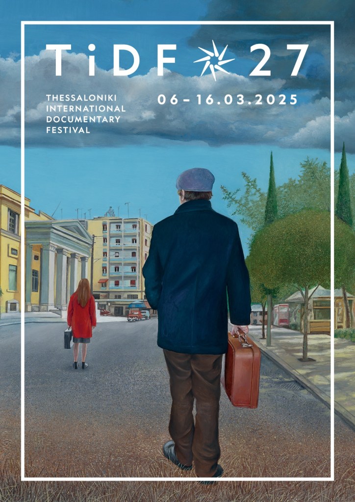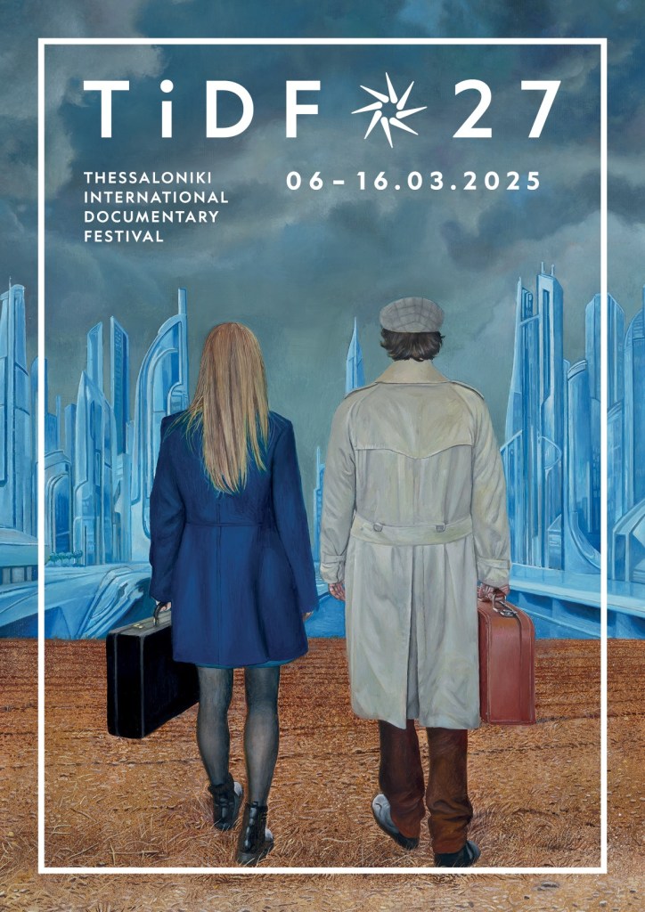 Ένα ταξίδι στο ελληνικό τοπίο, αλλά και σε πόλεις του μέλλοντος, πραγματοποιούν οι φιγούρες που απεικονίζονται στους τρεις ζωγραφικούς πίνακες που συνθέτουν τα πόστερ του 27ου Φεστιβάλ Ντοκιμαντέρ Θεσσαλονίκης. Χωρίς να βλέπουμε ποτέ τα πρόσωπά τους, οι άνθρωποι στις αφίσες του Φεστιβάλ κοιτάζουν μπροστά, προς αυτό που έρχεται. Τα τρία ζωγραφικά έργασυνομιλούν με τα αφιερώματα και τις θεματικές της φετινής διοργάνωσης. Με τα λόγια του ζωγράφου: «Οι τρεις ζωγραφιές συνθέτουν μια αφήγηση σε τρία μέρη. Αν μπουν στη σειρά, καθεμιά συνεχίζει την προηγούμενη. Η πρώτη και η δεύτερη (που δείχνουν ένα χωράφι και μια επαρχιακή πόλη της δεκαετίας του 1960) αναφέρονται στο ελληνικό τοπίο. Η τρίτη (που παρουσιάζει μια πόλη παράδοξη, φανταστική – ουτοπική ή δυστοπική) παραπέμπει στην τεχνητή νοημοσύνη. Οι θεατές, σαν χρονοταξιδευτές, ταξιδεύουν μέσα στα τοπία αυτά».