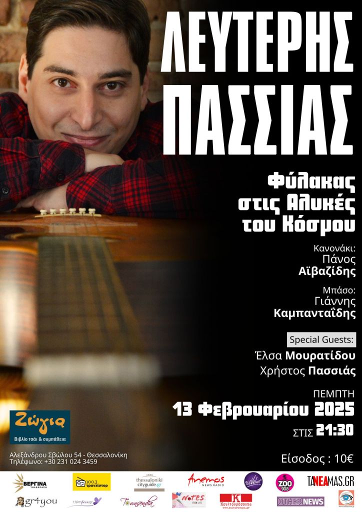 Ο τραγουδοποιός Λευτέρης Πασσιάς λίγο πριν την κυκλοφορία του δεύτερου δίσκου του, έρχεται για μια μοναδική εμφάνιση στην αγαπημένη «Ζώγια» στην Θεσσαλονίκη, παρέα με τον Γιάννη Καμπανταϊδη στο μπάσο και τον Πάνο Αϊβαζίδη στο κανονάκι! Φιλοξενούμενοι της βραδιάς η Έλσα Μουρατίδου και ο Χρήστος Πασσιάς!