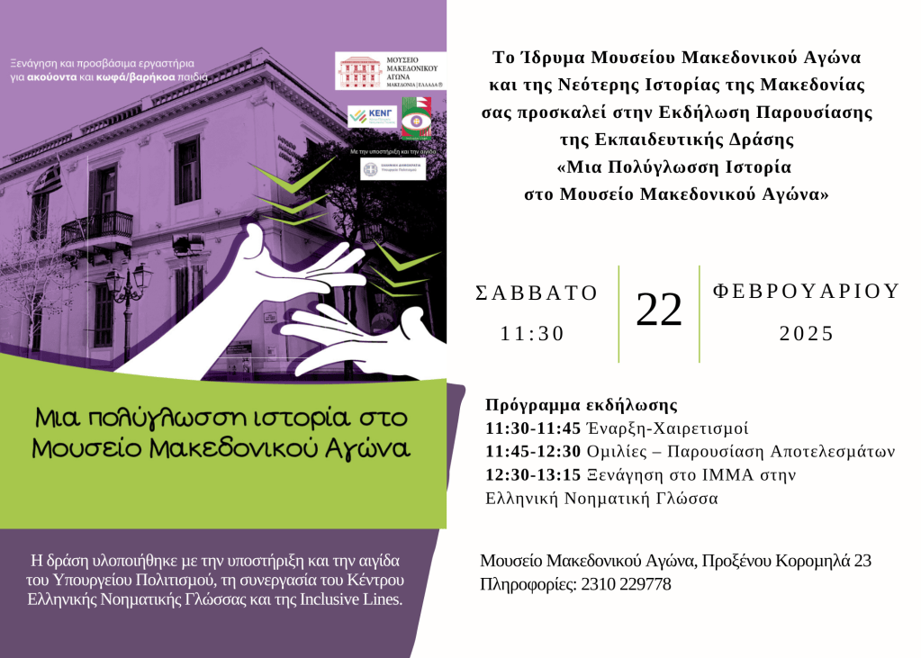 Το Ίδρυμα Μουσείου Μακεδονικού Αγώνα και της Νεότερης Ιστορίας της Μακεδονίας (ΙΜΜΑ) σας προσκαλεί στην εκδήλωση παρουσίασης των αποτελεσμάτων της Εκπαιδευτικής Δράσης «Μια πολύγλωσση ιστορία στο Μουσείο Μακεδονικού Αγώνα», που υλοποιήθηκε από τον Νοέμβριο 2024 έως τον Φεβρουάριο 2025, το Σάββατο 22 Φεβρουαρίου 2025, στις 11:30 π.μ.