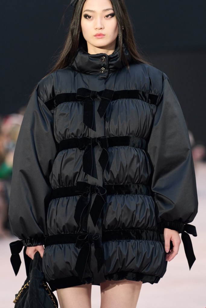 Το σκηνικό είχε έναν τεράστιο μαύρο φιόγκο που αποτελεί συνώνυμο των αξεσουάρ του οίκου μαζί με το tweed και την καμέλια. Έτσι και στη νέα συλλογή είδαμε και τα 3. Φιόγκοι επάνω σε πουκάμισα, μαύρα bomber jackets, one shoulder tops, πλεκτά πουλόβερ, παλτό, κάλτσες και πανωφόρια από μαύρο vinyl, το τούλι, τα παπούτσια με τακούνια από μαργαριτάρια, αλλά και τα tweed κοστούμια με trompe l’oeil. Επίσης είδαμε και διαφάνειες σε φούστες και σορτς, επάνω από πανωφόρια, σε μανίκια και maxi φορέματα, σε παντελόνια αλλά και tops με έξτρα φιόγκους και puff sleeves.