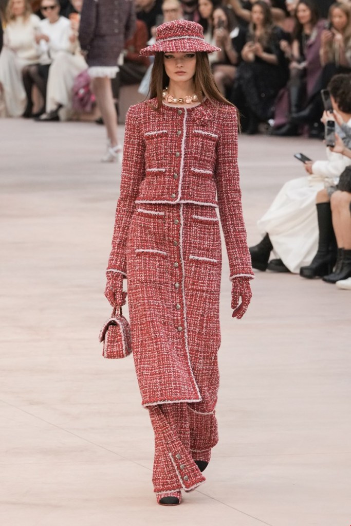 Το αγαπημένο ύφασμα της Gabrielle Chanel, δηλαδή το tweed είχε επίσης έντονη παρουσία στη συλλογή με κάπες και σακάκια, κοστούμια και παντελόνες, mini θηλυκά φορέματα, μπλούζες και co-ords. Σε αποχρώσεις του κόκκινου αλλά και του μπεζ, του μαύρου και του μπρονζέ.