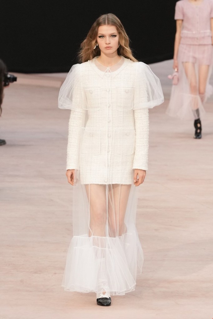 Η τάση με τα layers ήταν παρούσα και σε αυτή τη συλλογή σε σύνθεση με καμέλιες και πέρλες. Η σχεδιαστική ομάδα του γαλλικού οίκου παρουσίασε μια σύγχρονη συλλογή που τιμά την κληρονομιά και τα διαχρονικά στοιχεία του DNA του. Πάνω απ’ όλα, όμως, παρέμειναν πιστοί στο όραμα της Gabrielle Chanel, η οποία ήθελε τα ρούχα να χαρίζουν στις γυναίκες άνεση και ελευθερία κίνησης. «Δεν υπάρχει τίποτα πιο όμορφο από την ελευθερία του σώματος», συνήθιζε να λέει, και αυτή η φιλοσοφία αποτυπώνεται στη συλλογή μέσα από δημιουργίες που ισορροπούν αρμονικά ανάμεσα στην κομψότητα και την πρακτικότητα—δύο στοιχεία απαραίτητα για τη σύγχρονη γυναίκα.