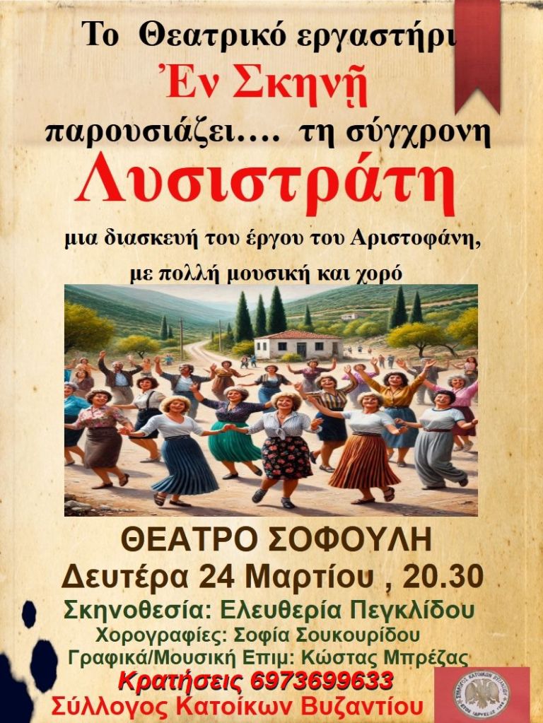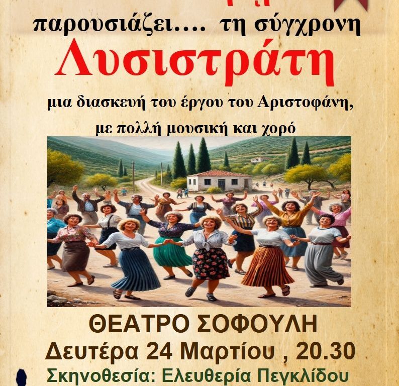 Η θεατρική ομάδα Έν Σκηνῇ παρουσιάζει τo θεατρικό έργο “Λυσιστράτη” την Δευτέρα 24/3 και ώρα 20:30. Μια σύγχρονη διασκευή, του έργου του Αριστοφάνη, με πολλή μουσική και χορό. Η ιστορία είναι γνωστή. Οι άνδρες θέλουν πόλεμο και οι γυναίκες ειρήνη. Για να επιτευχθεί αυτό… απαιτείται μία δόση πονηριά, τρεις δόσεις μηχανορραφία και άπειρες δόσεις μουσικής και χορού. Μια σύγχρονη διασκευή του έργου του Αριστοφάνη σκαρφισμένη με μπρίο και κέφι!