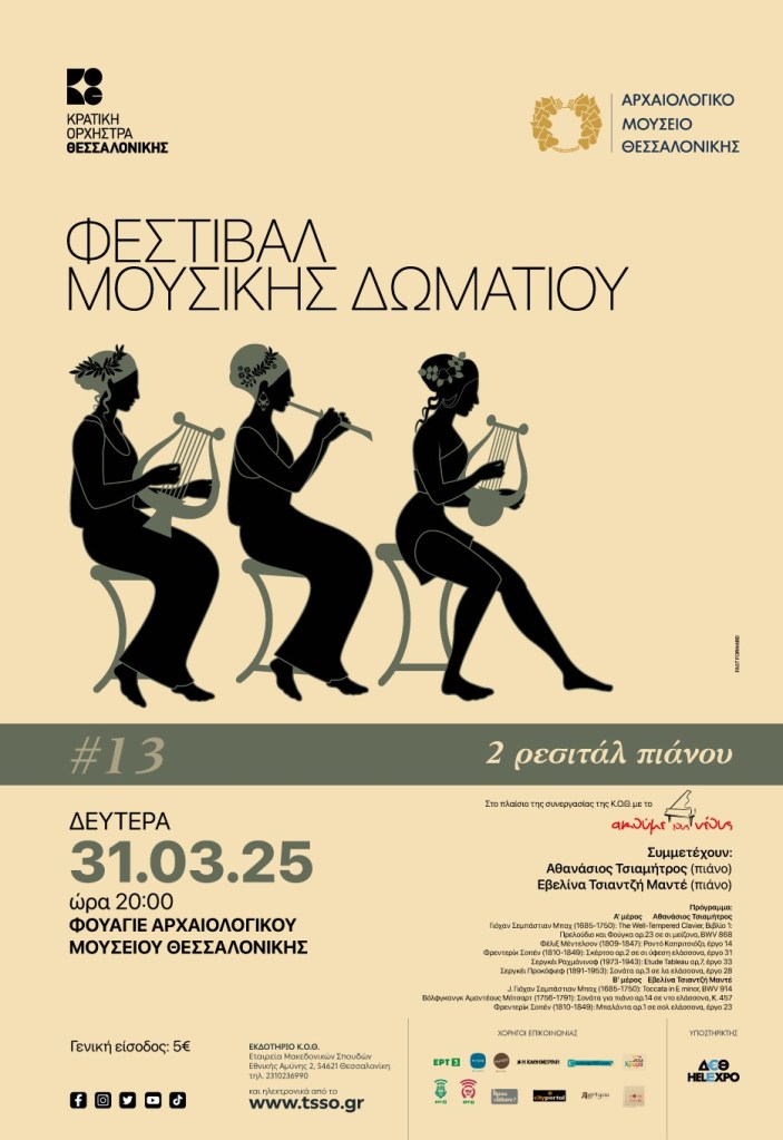 Το Φεστιβάλ Μουσικής Δωματίου που συνδιοργανώνουν η Κρατική Ορχήστρα Θεσσαλονίκης και το Αρχαιολογικό Μουσείο Θεσσαλονίκης, με την υποστήριξη του Υπουργείου Πολιτισμού, συνεχίζεται με δύο ρεσιτάλ πιάνου δύο νέων και ιδιαιτέρως ταλαντούχων πιανιστών, στο πλαίσιο της συνεργασίας της Κ.Ο.Θ. με το πρόγραμμα ‘Ακούμε τους Νέους’.