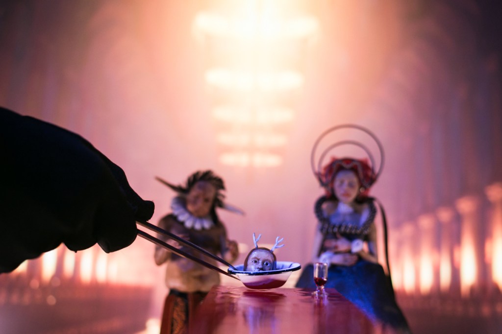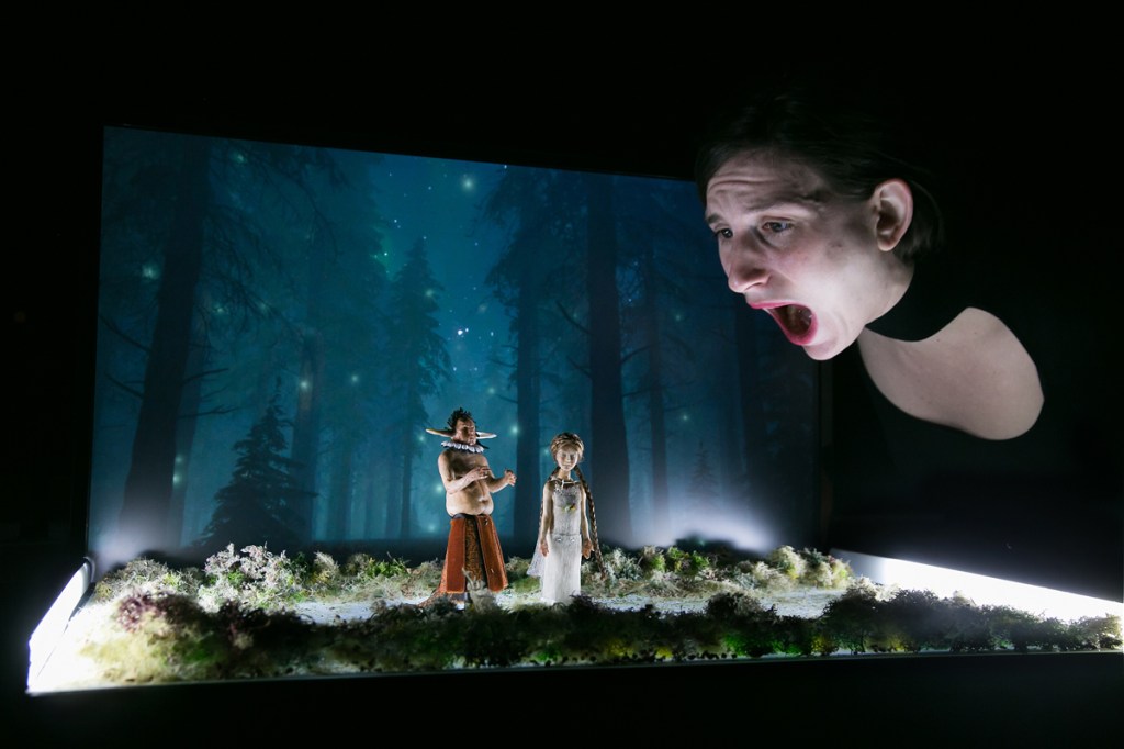 Στο κέντρο του σκηνικού χώρου – αποτελούμενο από δύο οθόνες που ζωντανεύουν τα σκηνικά περιβάλλοντα με την τέχνη της video art – οι δύο ηθοποιοί της παράστασης ξετυλίγουν τον μύθο με την βοήθεια μικρών γλυπτών, που αναπαριστούν τους ήρωες του έργου. Οι απόκοσμες μινιατούρες κινηματογραφούνται και προβάλλονται μεγεθυμένες σε μια τρίτη, μεγάλη οθόνη. Έτσι, από μικροσκοπικά, αδύναμα πλάσματα μέσα στα χέρια των ανθρώπων-θεών, μετατρέπονται σε τεράστια, τρομακτικά τέρατα. Το γεγονός ότι η ιστορία διαδραματίζεται μπροστά στα μάτια μας άλλοτε σε «μικρογραφία» και άλλοτε σε «μεγέθυνση» εντείνει τον τρόμο, τη βία και το τραγικό που εμπεριέχει.