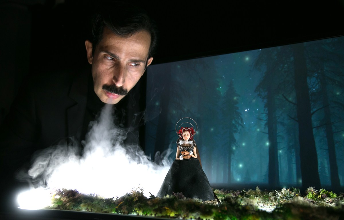 Στο κέντρο του σκηνικού χώρου – αποτελούμενο από δύο οθόνες που ζωντανεύουν τα σκηνικά περιβάλλοντα με την τέχνη της video art – οι δύο ηθοποιοί της παράστασης ξετυλίγουν τον μύθο με την βοήθεια μικρών γλυπτών, που αναπαριστούν τους ήρωες του έργου. Οι απόκοσμες μινιατούρες κινηματογραφούνται και προβάλλονται μεγεθυμένες σε μια τρίτη, μεγάλη οθόνη. Έτσι, από μικροσκοπικά, αδύναμα πλάσματα μέσα στα χέρια των ανθρώπων-θεών, μετατρέπονται σε τεράστια, τρομακτικά τέρατα. Το γεγονός ότι η ιστορία διαδραματίζεται μπροστά στα μάτια μας άλλοτε σε «μικρογραφία» και άλλοτε σε «μεγέθυνση» εντείνει τον τρόμο, τη βία και το τραγικό που εμπεριέχει.