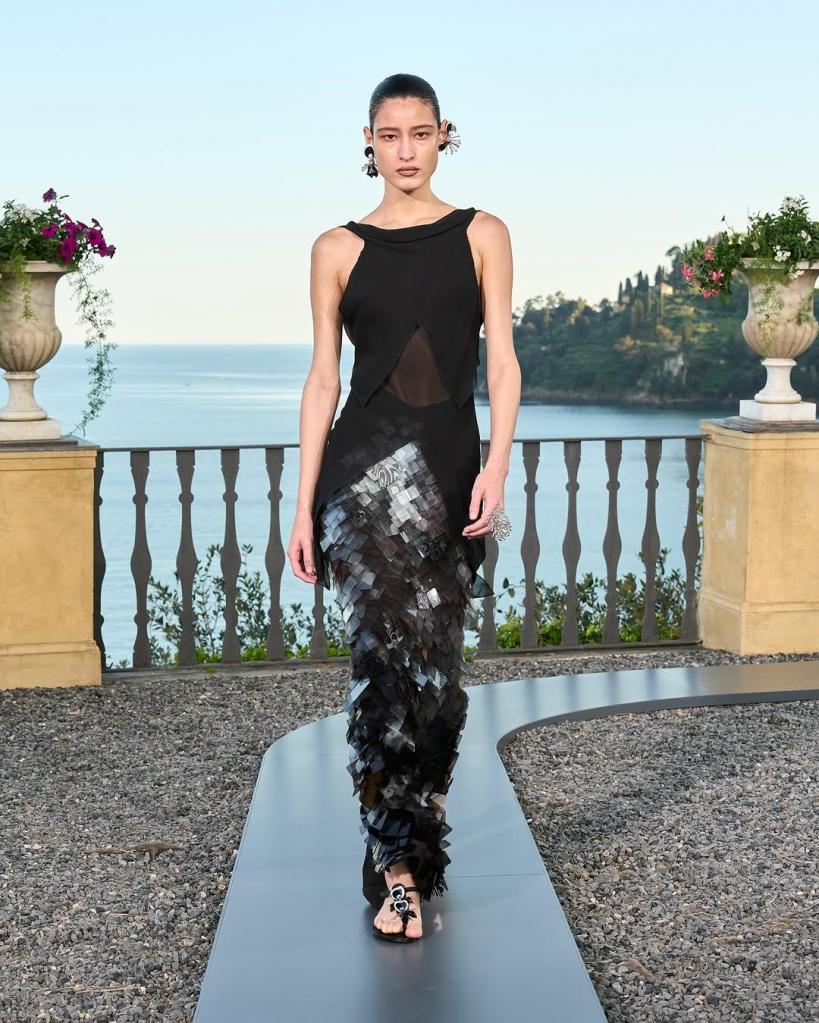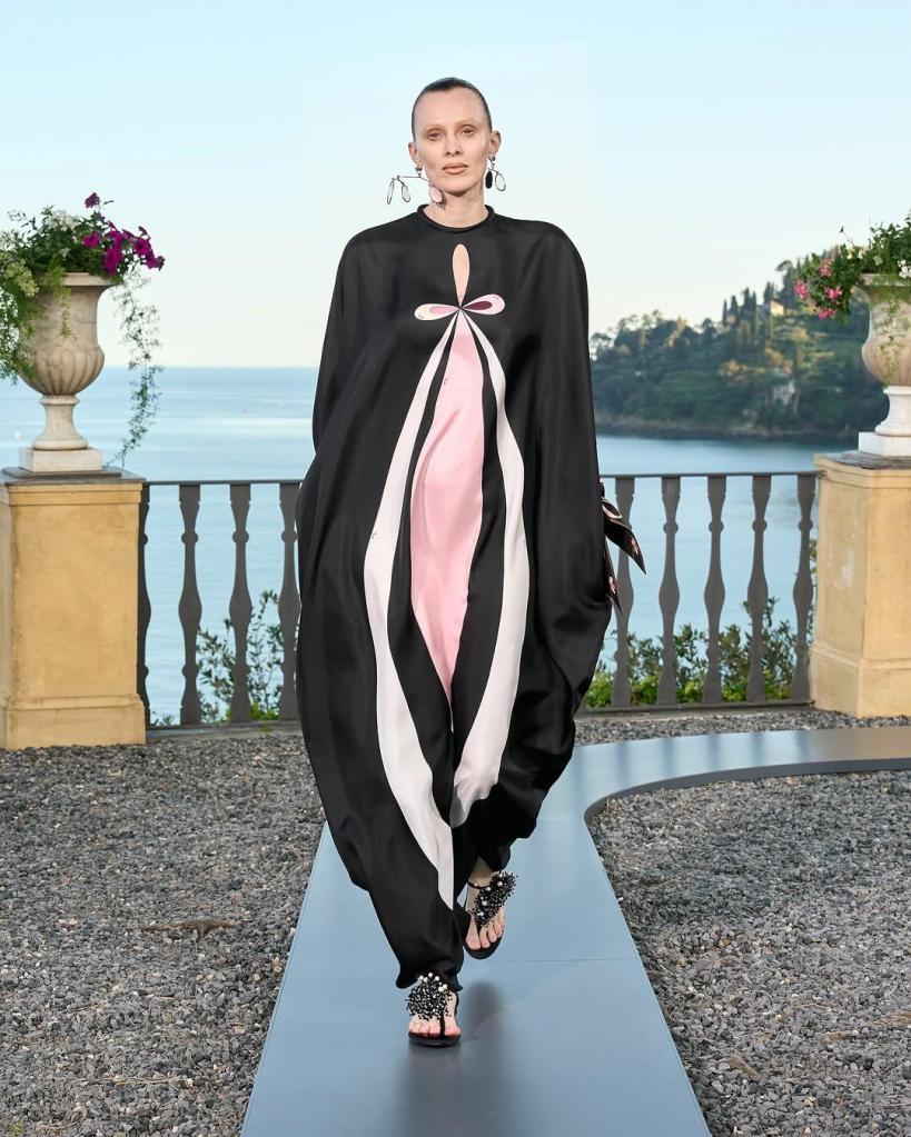 Η επίδειξη πραγματοποιήθηκε σε έναν χώρο μοναδικής αισθητικής και ιστορικής βαρύτητας: τη La Cervara, ένα επιβλητικό μοναστήρι του 12ου αιώνα που δεσπόζει στη διαδρομή προς το Πορτοφίνο. Σήμερα αναγνωρισμένο ως Εθνικό Μνημείο της Ιταλίας, το συγκρότημα αγκαλιάζει έναν αναγεννησιακό κήπο που «βλέπει» στο απέραντο γαλάζιο, με πέργκολες γεμάτες άνθη και πανοραμική θέα στον Κόλπο του Τιγκούλιο. Μέσα σε αυτήν την ατμόσφαιρα αρμονίας και μεγαλείου, η Camille Miceli επέλεξε τη μαγική ώρα του δειλινού για να παρουσιάσει τη συλλογή της. Με το φως του ήλιου να σβήνει αργά πίσω από τον ορίζοντα, 230 εκλεκτοί καλεσμένοι έγιναν μάρτυρες μιας εμπειρίας που ισορροπούσε μεταξύ μόδας και ποίησης. «Λατρεύω τα μικρά, ασπρόμαυρα βοτσαλωτά πατώματα», ανέφερε χαρακτηριστικά η Miceli. «Δεν σχεδιάζω τις συλλογές μου με βάση τις τοποθεσίες, αλλά αυτή εδώ… μοιάζει με όνειρο».