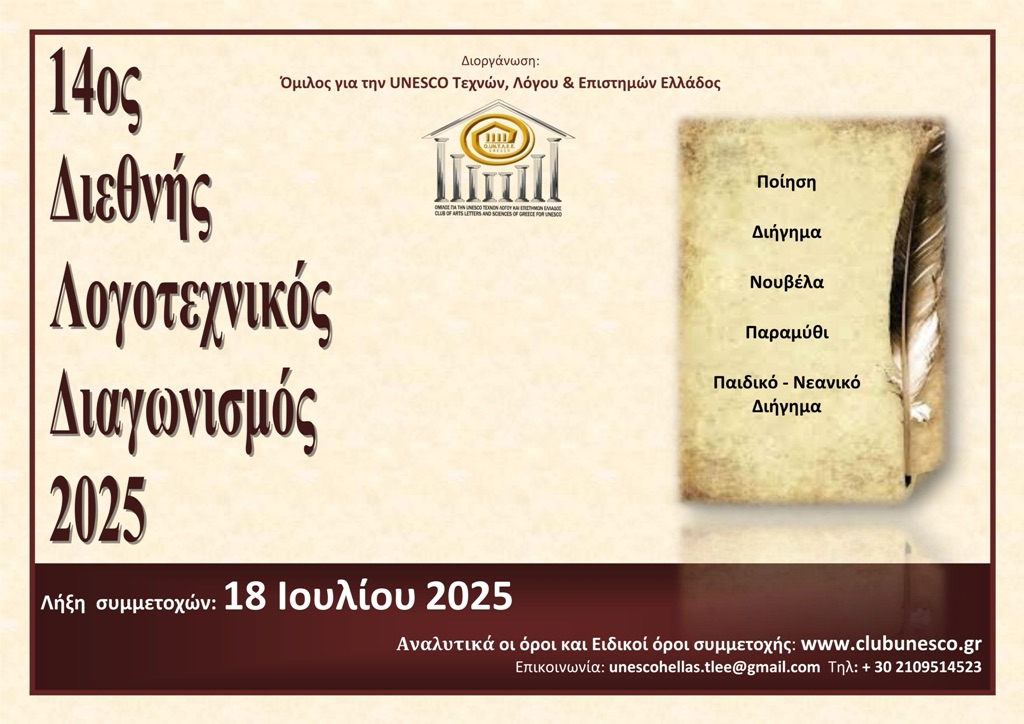 Ο Όμιλος για την UNESCO Τεχνών, Λόγου και Επιστημών Ελλάδος προκηρύσσει τον 14ο Διεθνή Λογοτεχνικό Διαγωνισμό 2025, με έναρξη την 30η Απριλίου και λήξη τη 18η Ιουλίου 2025. Ο διαγωνισμός περιλαμβάνει τα είδη του λόγου: Ποίηση, Διήγημα, Νουβέλα, Παιδικό παραμύθι, Παιδικό – νεανικό διήγημα.