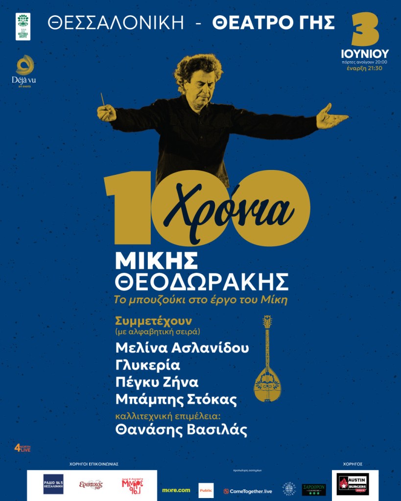 3 Ιουνίου: Αφιέρωμα στα 100 χρόνια του Μίκη Θεοδωράκη- Το μπουζούκι στο έργο του Μίκη – Καλλιτεχνική επιμέλεια: Θανάσης Βασιλάς / Θέατρο Γης. Εισιτήρια εδώ.