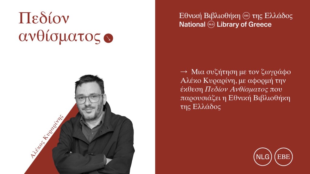 Η Εθνική Βιβλιοθήκη της Ελλάδος (ΕΒΕ) με αφορμή την έκθεση «Αλέκος Κυραρίνης. Πεδίον Ανθίσματος» σας προσκαλεί να ακούσετε στο επίσημο κανάλι της στο YouTube, μια συζήτηση, με τον ίδιο τον ζωγράφο, πάνω σε ζητήματα πέραν της ζωγραφικής.