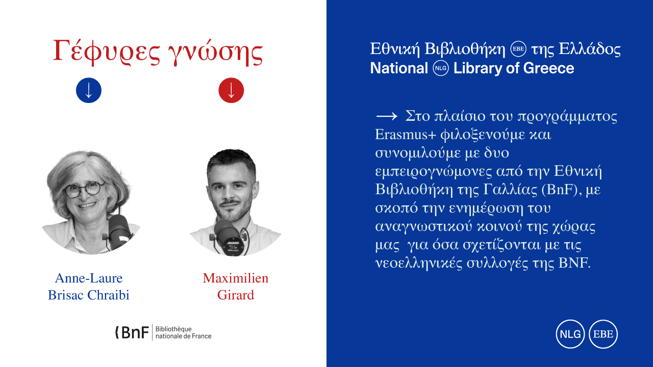 Η Εθνική Βιβλιοθήκη της Ελλάδος (ΕΒΕ), με αφορμή την επίσκεψη δύο εμπειρογνωμόνων από την Εθνική Βιβλιοθήκη της Γαλλίας (BnF), σας προσκαλεί να παρακολουθήσετε στο επίσημο κανάλι της στο YouTube τη συζήτηση που πραγματοποιήθηκε με αντικείμενο τις νεοελληνικές συλλογές της BnF.