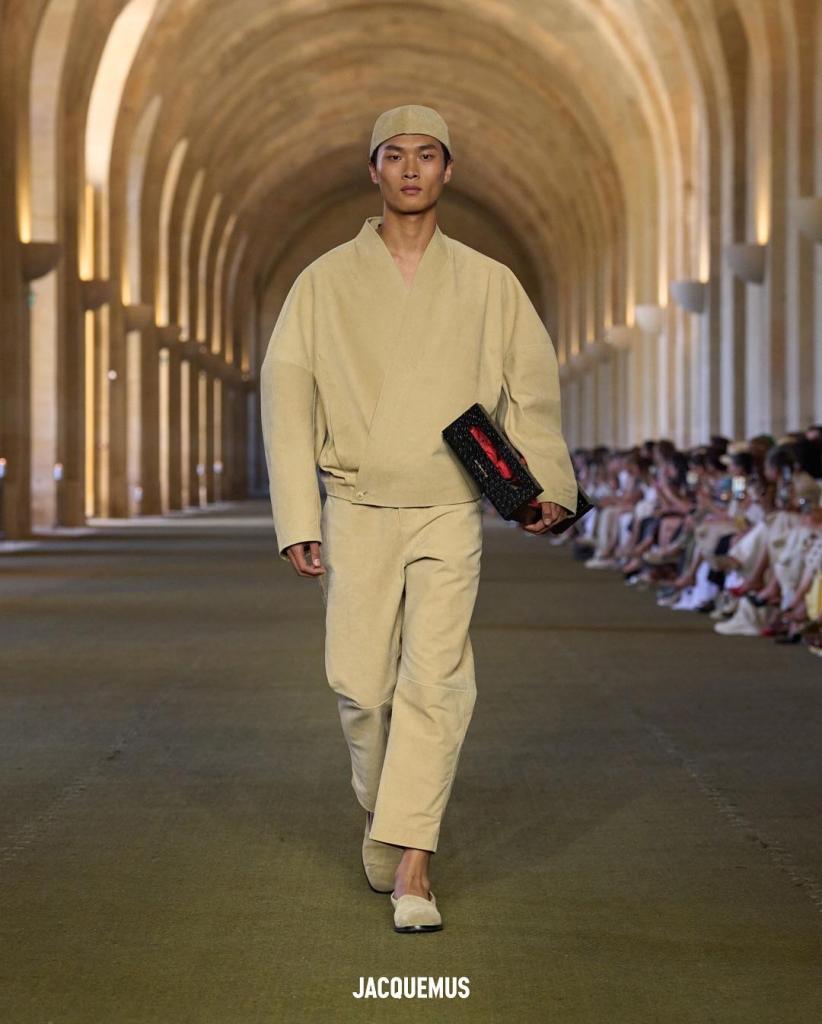 Στο μεταξύ, η ανδρική σειρά μοιάζει σαν χαρακτήρας βγαλμένος από μυθιστόρημα του Μαρσέλ Παλιόλ: αγροτικός αλλά εκλεπτυσμένος. Κοντά σακάκια και παντελόνια με φαρδιά γραμμή εμφανίζονται σε ανάλαφρα λινά και δέρματα σαν αεράκι, διακοσμημένα με ρίγες σε τοπ-ραφές ή διακριτικά μοτίβα ψαροκόκαλου. Η παλέτα είναι προσεκτικά επιλεγμένη: γαλακτερό λευκό, κρεμ και μαύρο, πλαισιωμένα από απαλές αποχρώσεις του μπλε, ροζ και κίτρινου, που θυμίζουν καραμέλες αμυγδάλου και κλασικές ρίγες τύπου Berlingot.