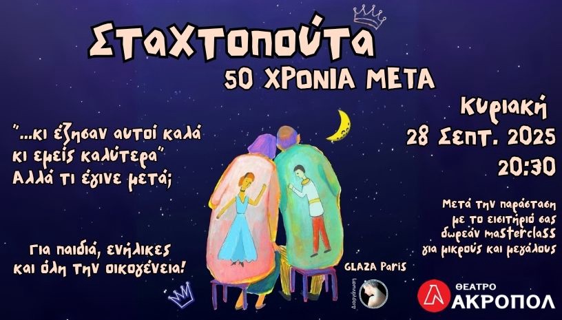 «Σταχτοπούτα, 50 χρόνια μετά». Η διάσημη παριζιάνικη ομάδα Glaza παρουσιάζει στο Θέατρο Ακροπόλ την πιο τρυφερή και αστεία παράσταση της χρονιάς. Μια πρωτότυπη θεατρική εμπειρία χωρίς λόγια, βασισμένη στη μαγεία του σωματικού θεάτρου με χιούμορ, συγκίνηση και μαγεία!