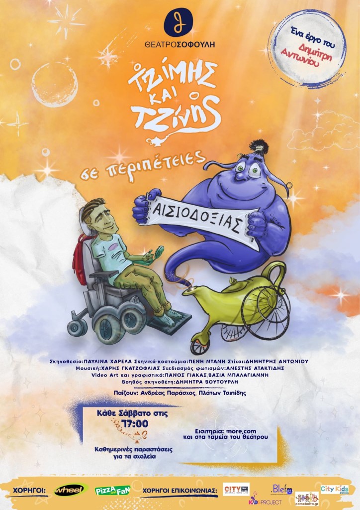 Το Θέατρο Σοφούλη για τη θεατρική σεζόν 2025-2026 παρουσιάζει την παράσταση «Ο Τζίμης και ο Τζίνης, σε περιπέτειες αισιοδοξίας” βασισμένη στο ομώνυμο μυθιστόρημα του Δημήτρη Αντωνίου και σκηνοθεσία Παυλίνας Χαρέλα.
