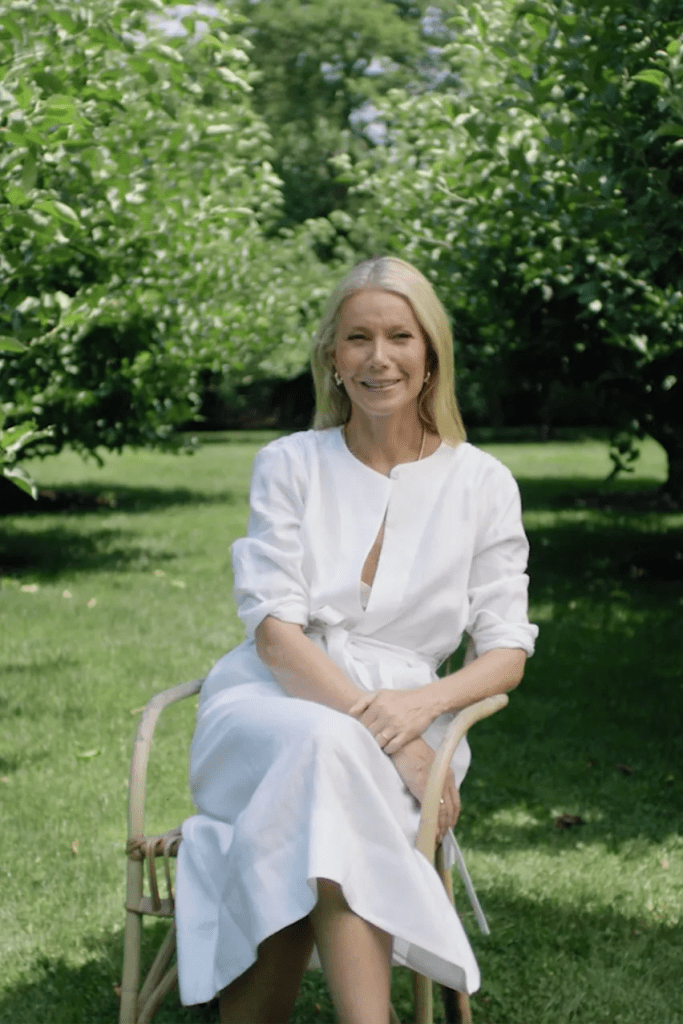«Οι υπόλοιπες ανησυχίες μου απλώς… εξαφανίζονται», λέει η Γκουίνεθ Πάλτροου, καθώς υποδέχεται τη Vogue στο γαλήνιο σπίτι της στο Άμαγκανσετ και στους καταπράσινους κήπους της. Μαζί με τον αγαπημένο της σκυλάκο-σύντροφο στις καθημερινές βόλτες, τον Γκάουτσο, περνά ήσυχες στιγμές ανάμεσα στη φύση, μαζεύοντας φρέσκα φρούτα, λαχανικά και μυρωδικά, που αργότερα χρησιμοποιεί στην κουζίνα της για να ετοιμάσει απλά αλλά θρεπτικά γεύματα.