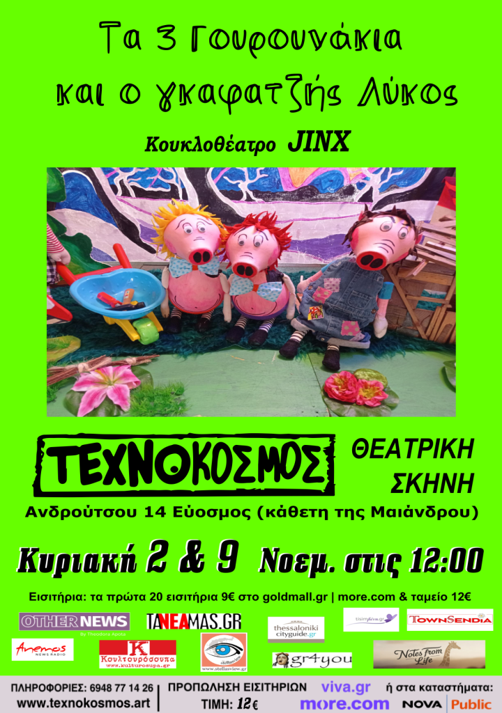 Η Θεατρική Σκηνή Τεχνόκοσμος υποδέχεται την ομάδα κουκλοθέατρου JINX με την ξεκαρδιστική παράσταση «Τα Τρία Γουρουνάκια και ο Γκαφατζής Λύκος», την Κυριακή 2 και 9 Νοεμβρίου, στις 12:00 το μεσημέρι.