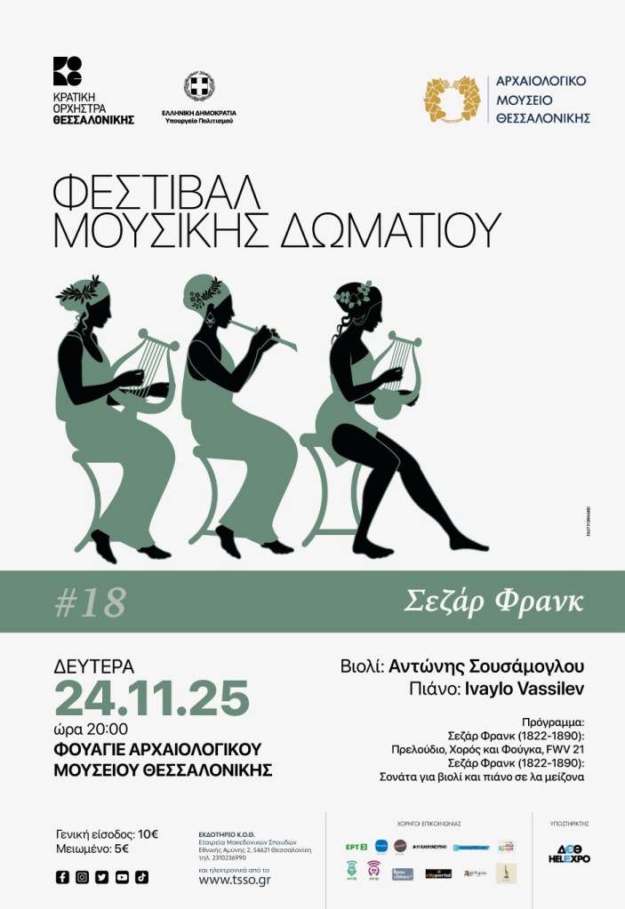 Το Φεστιβάλ Μουσικής Δωματίου που συνδιοργανώνουν η Κρατική Ορχήστρα Θεσσαλονίκης και το Αρχαιολογικό Μουσείο Θεσσαλονίκης, με την υποστήριξη του Υπουργείου Πολιτισμού, συνεχίζεται με έργα του σπουδαίου Γάλλου συνθέτη φλαμανδικής καταγωγής Σεζάρ Φρανκ, ο οποίος υπήρξε μία κορυφαία φυσιογνωμία στη γαλλική μουσική σκηνή του 19ου αιώνα ασκώντας τεράστια επιρροή στην επόμενη γενιάΓάλλων δημιουργών, με αποτέλεσμα να θεωρείται από τους πλέον επιδραστικούς συνθέτες στην εξέλιξη της γαλλικής μουσικής. Ο Φρανκ δημιούργησε τη σύγχρονη γαλλική σχολή για όργανο, αποκάλυψε στους μαθητές του τη μεγαλοφυΐα του Μπαχ και εισήγαγε, μεταξύ άλλων, το πρότυπο της κυκλικής φόρμας, όπου η επανεμφάνιση ενός θέματος ή κάποιου μελωδικού αποσπάσματος, επιβεβαιώνει τη συνοχή ολόκληρης της σύνθεσης.