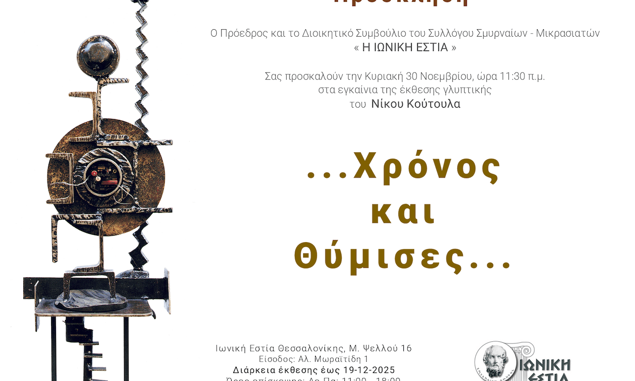 Ο Σύλλογος Σμυρναίων – Μικρασιατών «Η Ιωνική Εστία» παρουσιάζει την έκθεση γλυπτικής του Θεσσαλονικιού καλλιτέχνη Νίκου Κούτουλα, με τίτλο «…Χρόνος και Θύμισες…». Την εκδήλωση θα ανοίξει ο Πρόεδρος του Συλλόγου, Γεώργιος Χονδρογιαννίδης, ο οποίος θα καλωσορίσει τους παρευρισκόμενους και θα παρουσιάσει τον δημιουργό της έκθεσης. Αμέσως μετά, ο γλύπτης Νίκος Κούτουλας θα προχωρήσει σε έναν σύντομο αυτοπροσδιορισμό, μιλώντας για το έργο, τη διαδρομή και τη φιλοσοφία του. Θα ακολουθήσει συζήτηση με το κοινό και απαντήσεις σε ερωτήσεις, σε ένα άμεσο και ζωντανό καλλιτεχνικό διάλογο. Με το πέρας της παρουσίασης, οι παρευρισκόμενοι θα έχουν την ευκαιρία να απολαύσουν έναν μικρό μπουφέ, σε μια χαλαρή και φιλική ατμόσφαιρα.