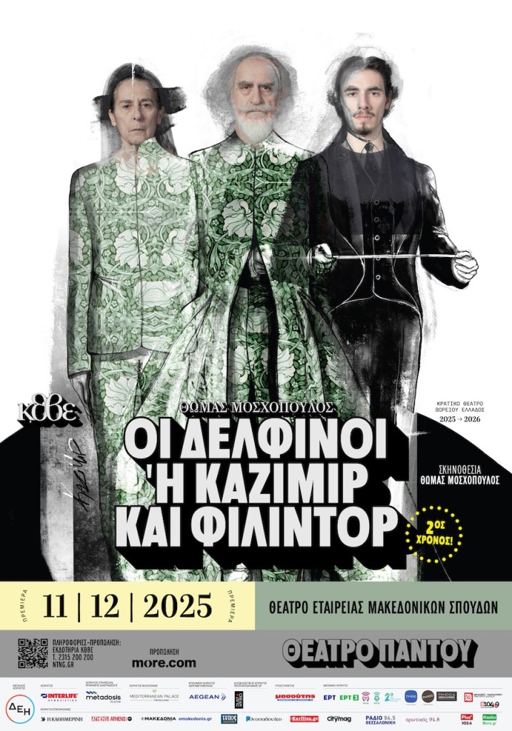 «Οι Δελφίνοι ή Καζιμίρ και Φιλιντόρ», που παρουσιάστηκε σε πανελλήνια πρώτη τον Μάιο στο ΚΘΒΕ με μεγάλη επιτυχία, επιστρέφει για 2η χρονιά στο Θέατρο της Εταιρείας Μακεδονικών Σπουδών. Το νέο έργο που υπογράφει και σκηνοθετεί ο Θωμάς Μοσχόπουλος, ένας από τους πιο δημιουργικούς και καινοτόμους καλλιτέχνες της γενιάς του, σκηνοθέτης, συγγραφέας και μεταφραστής, είναι ένα παιχνίδι λόγου με έντονα στοιχεία παρωδίας και σαρκασμού, το οποίο πραγματεύεται τα θέματα της εξουσίας και του ανταγωνισμού, σε ένα κείμενο που συνομιλεί ανοιχτά με τον Σάμιουελ Μπέκετ.