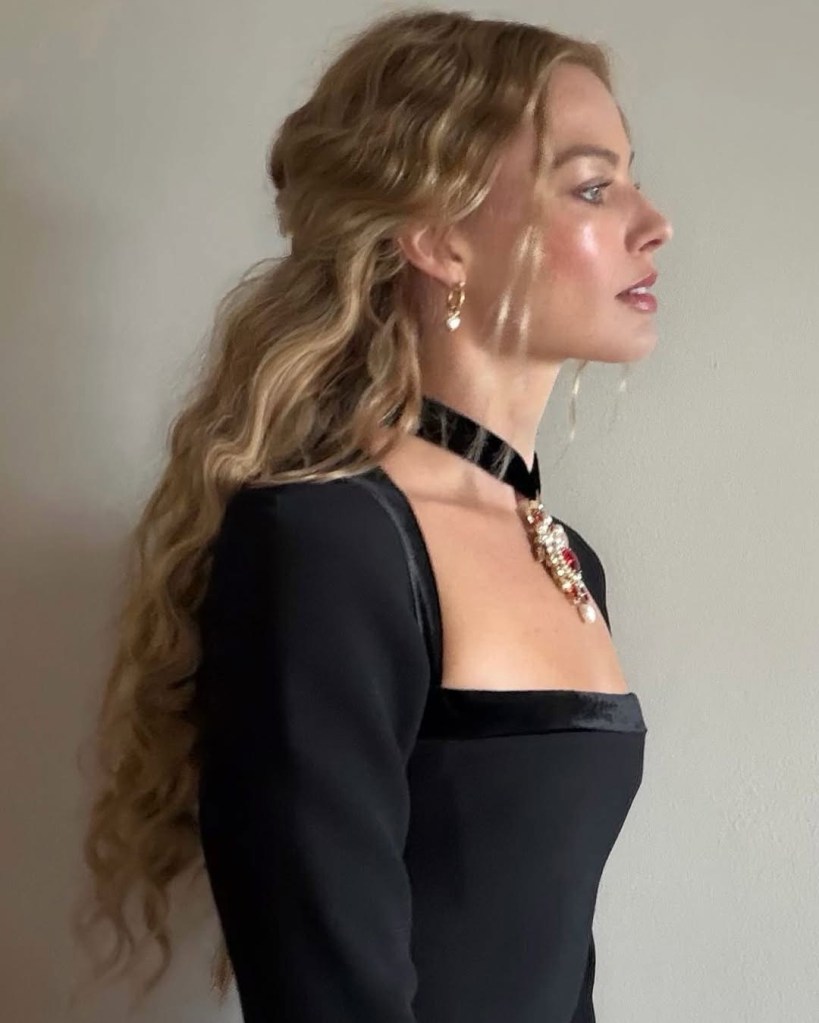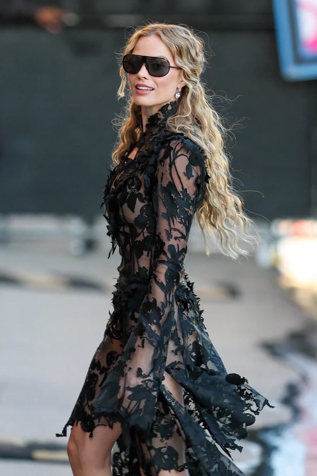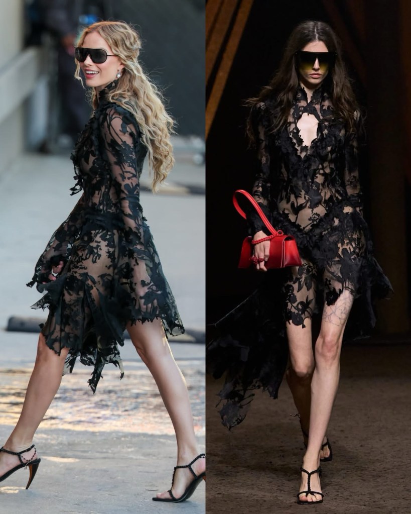 Το πρώτο λουκ εμφανίστηκε στον λογαριασμό του fashion stylist Andrew Mukamal -που συνεργάστηκε με την Ρόμπι για το tour press της ταινίας Barbie- και η ηθοποιός φορά ένα μίνι μαύρο φόρεμα από τη συλλογή Roberto Cavalli Resort 2026 συνδυασμένο με ψηλές γόβες Christian Louboutin και γκόθικ κρεμαστό στο λαιμό.