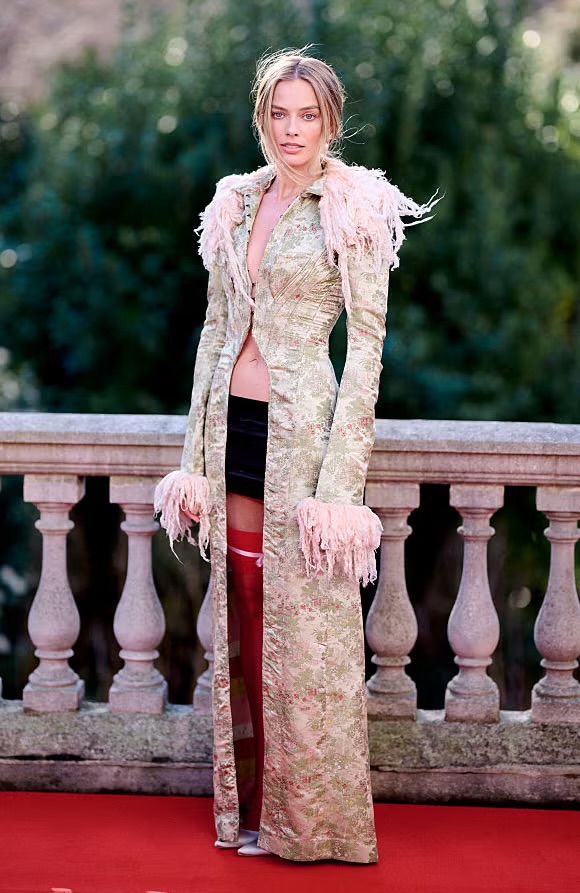 Σε φωτογράφιση στο Λονδίνο, η Ρόμπι φόρεσε ένα σύνολο John Galliano από τη συλλογή Άνοιξη/Καλοκαίρι 1992, που περιλάμβανε ένα πολυτελές παλτό με γούνινες λεπτομέρειες, μαύρη μίνι φούστα και κόκκινες κάλτσες.